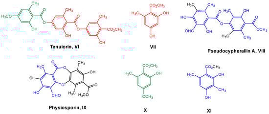 Chemical structures of lichen and monomeric compounds. The colors represent a part of the lichen structure that could be derived from VII, X, or XI.
