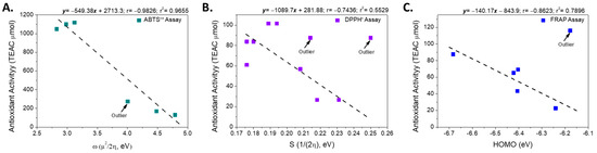 Linear relationship between the electronic descriptors and the antioxidant activity according to assays: (A) ABTS•+, (B) DPPH• and (C) FRAP.