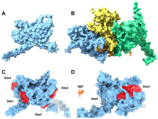 (A) Three-dimensional representation of the monomeric RecA unit in S. pyogenes. (B) Representation of the RecA system with DNA fragments based on the 3CMT template of E. coli. The system consisted of three RecA units (light blue, yellow, and green), an orange DNA strand, and ADP in the ATP-binding domain of the RecA protein. The binding sites are represented by red polyhedra. (C) Front view of the RecA protein, which is colored light blue, and (D) back view of the RecA protein.
