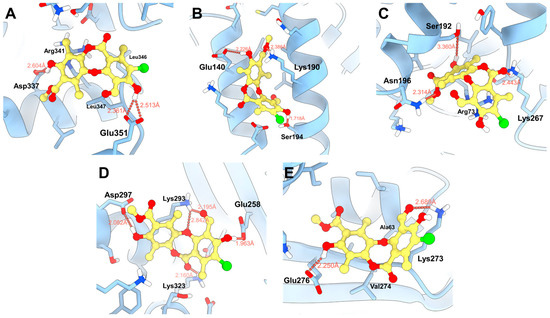 Molecular docking studies were performed for the five binding sites identified with physciosporin IX, considering the first ten poses for each site (Figure S4). Both the maximum affinity value and the average of each pose, as well as the average affinity energy of all poses, were analyzed. Initially, IX showed a higher affinity for binding site 4, with an affinity energy of −4.438 kcal/mol. As shown in Figure 7D, the hydroxyl groups of IX formed bonds with Asp297 at 2.082 Å and Glu258 at 1.963 Å. There are additional interactions with Lys293 that establish bonds with the aldehyde carbonyl and cyclic ether of the central core of IX. In addition, the carbonyl group of the lactone region interacted with Lys323 at 2.160 Å, contributing to the high affinity observed in the docking studies.
