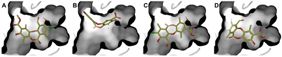 Authors such as Zhou [56], Alam [17], Kiran [57], among others, point out that the inhibition of RecA activity is mainly due to the inhibition of the ATPase active site, composed of residues Glu81, Lys85, Glu109, Tyr116, Asp157, and Gln207. Therefore, a RecA complex was constructed in AlphaFold 3 considering three units of RecA, ADP, Mg2+, and nucleic acid (Figures S5 and S6). The system was refined with 5 ns minimization to improve the side-chain arrangement. Molecular docking was performed at the ADP-binding site. Four poses (Figure 8) of physciosporin at the binding site were identified.