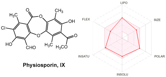 Drug-like properties, such as pharmacokinetic (ADME) and pharmacodynamic (e.g., toxicological) profiles, are important during drug discovery and development. These properties demonstrate the optimization of a leading compound as a successful candidate in the preclinical stages [58]. ADMET properties are important for determining chemical descriptors, such as the polar surface area (PSA) and molecular weight (MW) of molecules, which are useful for determining the oral absorption of drugs. Small hydrophilic molecules undergo rapid renal clearance, whereas large hydrophobic compounds undergo extensive hepatic metabolism and poor absorption [59]. Therefore, finding a suitable hydrophilic-hydrophobic drug balance is a significant challenge for medicinal chemists. Thus, to evaluate these properties and predict good oral bioavailability, two sets of rules, Lipinski and Veber, should be followed for a good prediction [60]. Lipinski’s rule of five states that an orally bioavailable molecule should not violate the following criteria: ≤5 hydrogen bond donors (HBD), ≤10 hydrogen bond acceptors (HBA), MW < 500, and log p-value < 5. In contrast, Veber et al. described the role of PSA and the number of rotatable bonds as criteria for estimating oral bioavailability. Veber’s rule states that a compound that is orally bioavailable should have either a PSA ≤ 140 Å and ≤10 rotatable bonds (NRB) or ≤12 HBD and HBA in total and ≤10 rotatable bonds. As shown in Table 7, physciosporin IX achieved the drug-likeness criteria described by Lipinski and Veber; therefore, they are expected to have good oral bioavailability. In addition, from SwissADME (http://www.swissadme.ch/index.php, accessed on 17 May 2025), the bioavailability radar chart showed that IX is in the desired range (pink region) of five parameters from the six parameters used for oral absorption prediction: FLEX (flexibility), LIPO (lipophilicity), INSOLU (solubility), SIZE, and POLAR (polarity), while they are in the undesirable area of INSATU (saturation) (Figure 10), confirming their good oral bioavailability.
