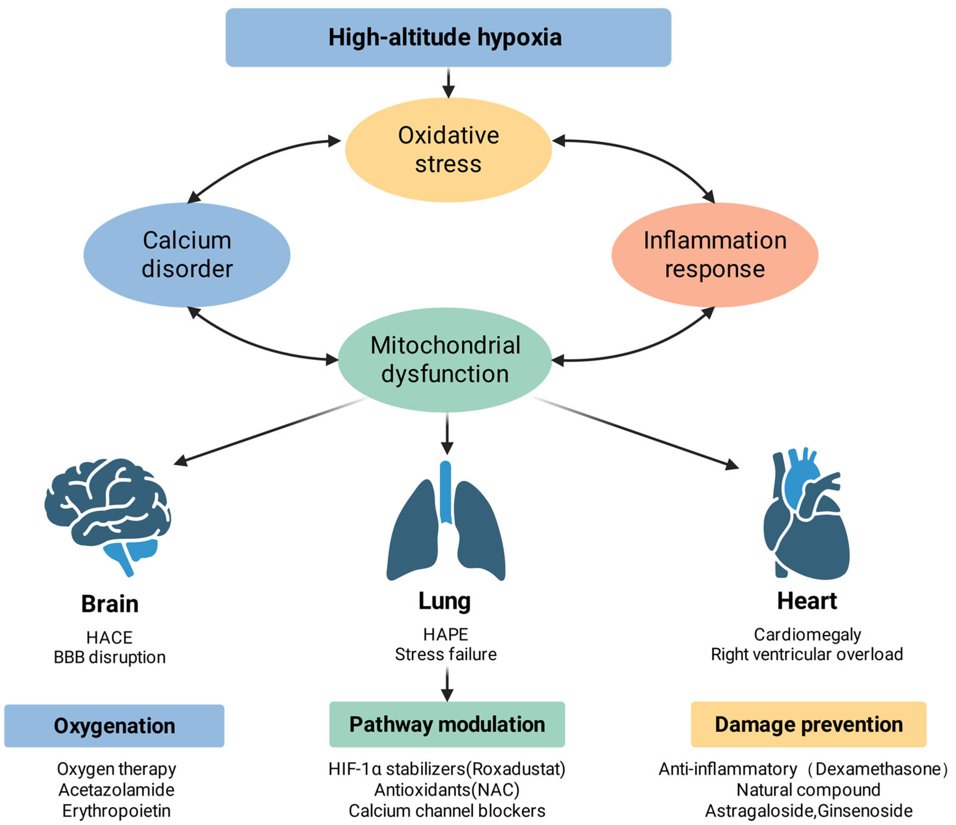 | Underlying Mechanisms | Rapid nerve and vascular response, Cellular energy metabolism disorder, Oxidative stress and inflammation, Ion channels and membrane potential changes | Metabolic reprogramming, Tissue fibrosis and structural remodeling, Red blood cells and blood system adaptation, Angiogenesis and remodeling |