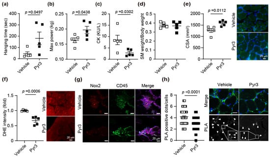 Ibudilast not only inhibits TRPC3-Nox2 complex formation but also inhibits phosphodiesterase 4 (PDE4) [34]. Therefore, we used Pyr3, a TRPC3 inhibitor that more specifically inhibits this complex formation, to evaluate whether the TRPC3-Nox2 complex is involved in muscle atrophy [25]. Measurements were taken 4 weeks after the drug administration. Hanging time and maximal grip strength (Max power) were significantly increased in Pyr3-treated mdx mice (Figure 4a,b). CK levels were significantly decreased in Pyr3-treated group than in the vehicle group (Figure 4c). The body weight and muscle weights of TA, EDL, GM, SM, and QM of mdx mice treated with vehicle were not significantly different from those in Pyr3-treated group (Figure 4d and Figure S3a–e). Mdx mice treated with Pyr3 had significantly increased CSA compared with the vehicle group (Figure 4e). ROS production in SM was suppressed by Pyr3-treatment (Figure 4f). Pyr3 suppressed the expression of Nox2 in CD45-positive blood cells infiltrating skeletal muscle cells in mdx mice (Figure 4g). The SM of mdx mice treated with Pyr3 significantly reduced the number of PLA-positive signals compared with the vehicle group (Figure 4h). These results suggest that inhibition of complex formation between TRPC3 and Nox2 by Pyr3 prevents muscle atrophy.