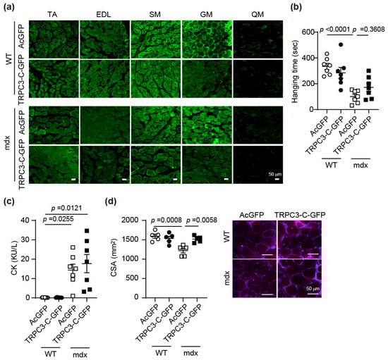 Pharmacological inhibition of TRPC3-Nox2 complex formation improved muscle atrophy. Next, to verify the efficacy of enhancing muscle atrophy from an endogenous source, the C-terminal peptide of TRPC3, which inhibits TRPC3-Nox2 complex formation, was overexpressed in the hindlimb skeletal muscle of WT and mdx mice by AAV. This C-terminal protein does not affect Ca2+ influx through TRPC3 even when overexpressed and has been shown to inhibit ROS production mediated via Nox2 [22]. WT and mdx mice administered each AAV showed no change in body weight. Although the muscles of mdx mice were significantly larger, there was no difference in muscle weight between AcGFP and TRPC3 C-terminal peptide (Figure S4). This peptide was expressed in the TA, EDL, and SM, including the injection site GM, but not in the QM (Figure 5a). In mdx mice expressing TRPC3-C-GFP, hanging time was not increased (Figure 5b). CK showed no significant difference between AcGFP and TRPC3-C-GFP groups of mdx mice (Figure 5c). CSA was reduced compared with that of WT mice in mdx mice and was restored in mdx mice expressing TRPC3-C-GFP (Figure 5d). These results suggested that inhibition of the TRPC3/Nox2 interaction by the C-terminal peptide suppressed muscle atrophy.