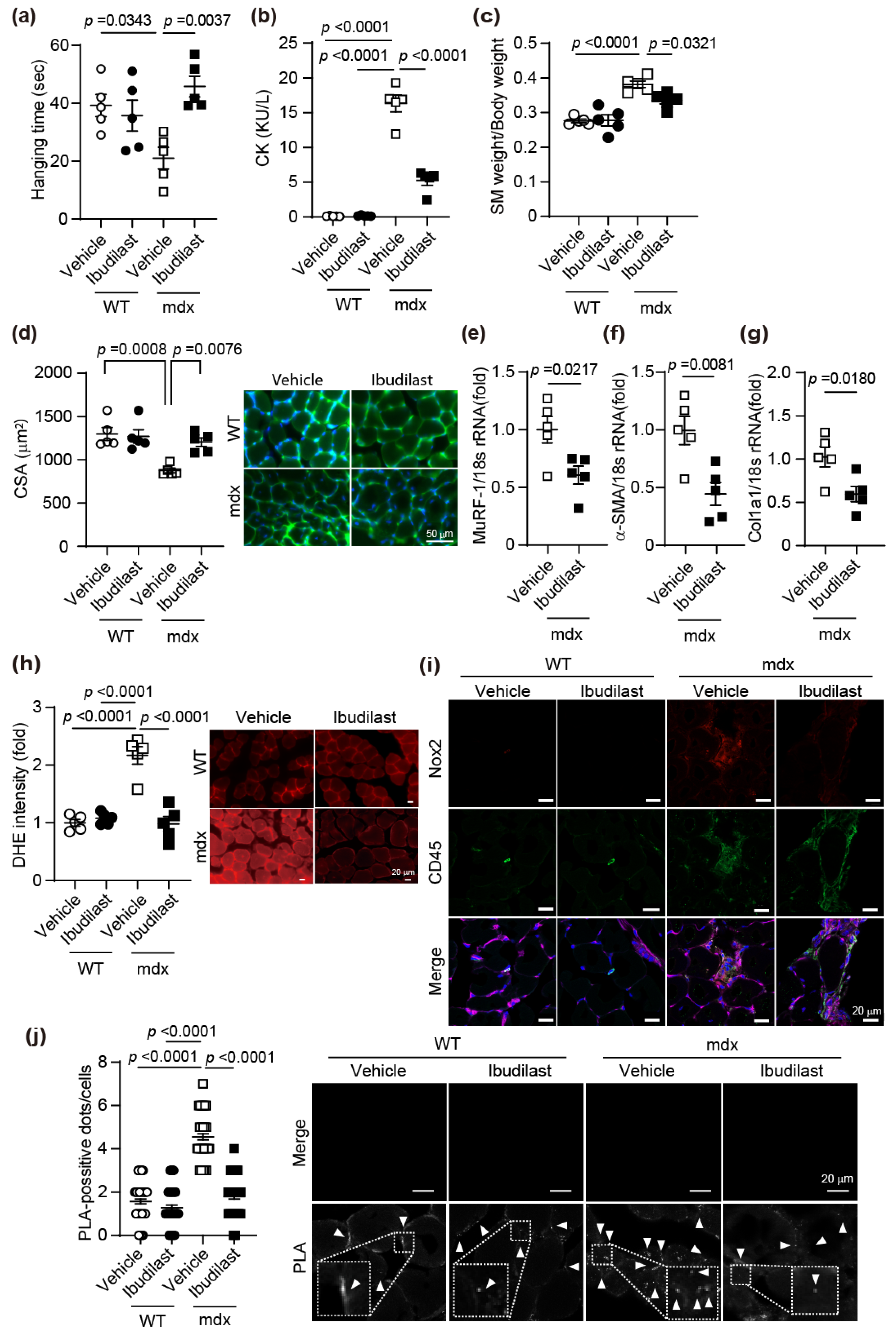 3.3. Ibudilast Inhibits TRPC3-NOX2 Complex Formation and Ameliorates Muscle Wasting