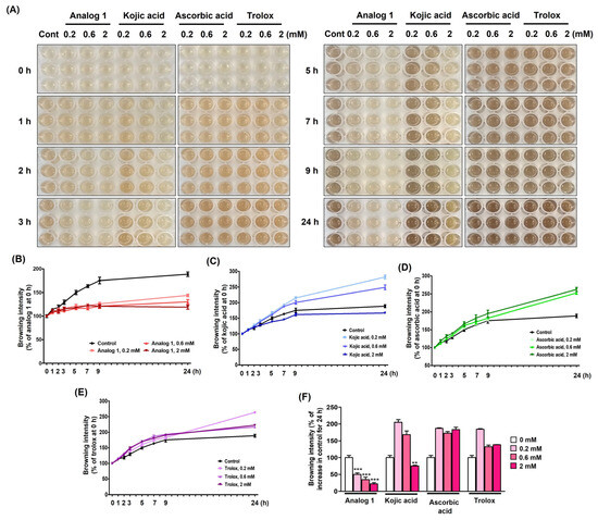 - Jeon, S.-H.; Kim, K.-H.; Koh, J.-U.; Kong, K.-H. Inhibitory effects on L-dopa oxidation of tyrosinase by skin-whitening agents. Bull. Korean Chem. Soc. 2005, 26, 1135–1137. [Google Scholar][Green Version]