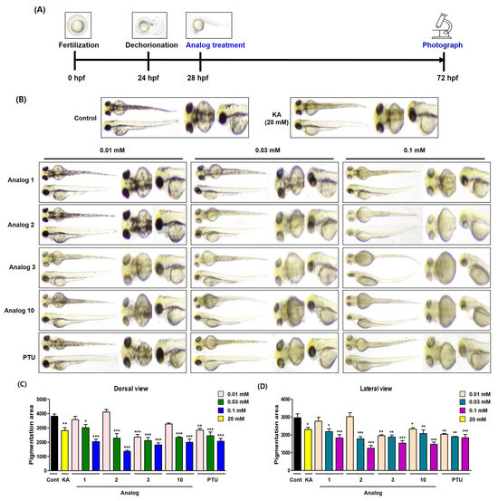 2.11. Assay for Depigmentation of Zebrafish Larvae [45,46]