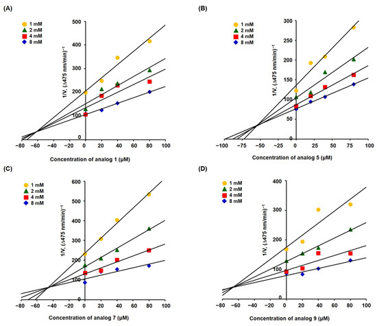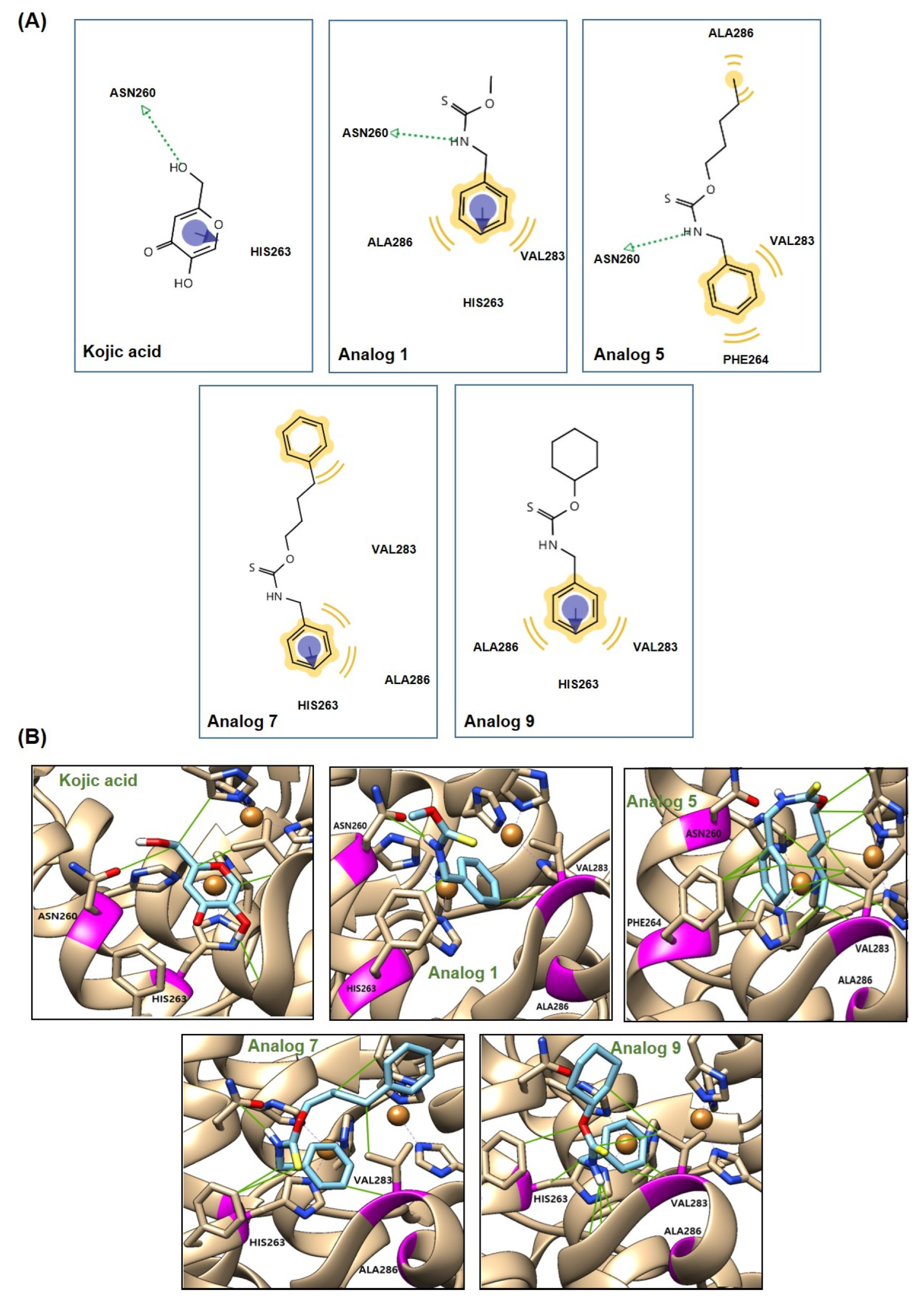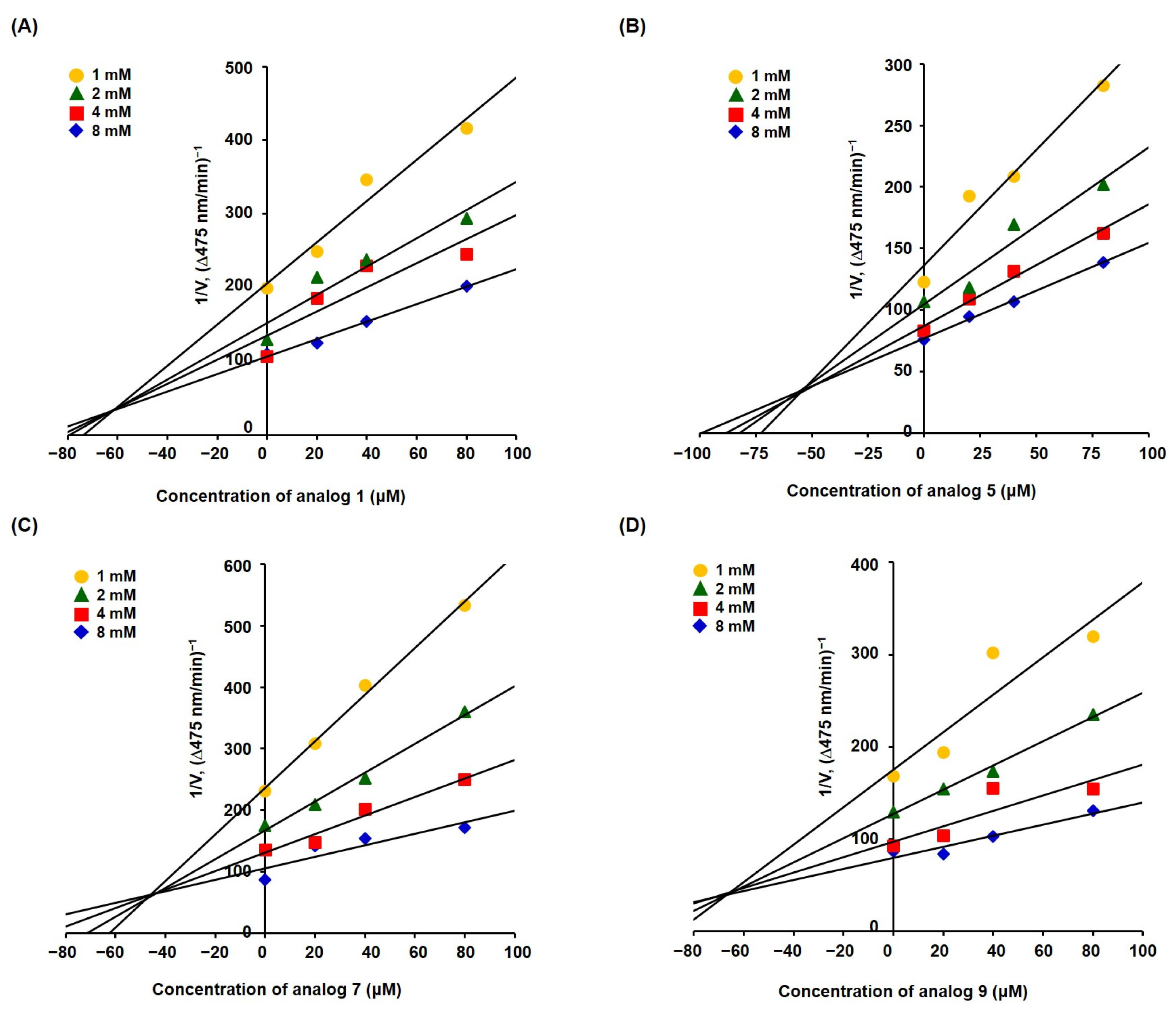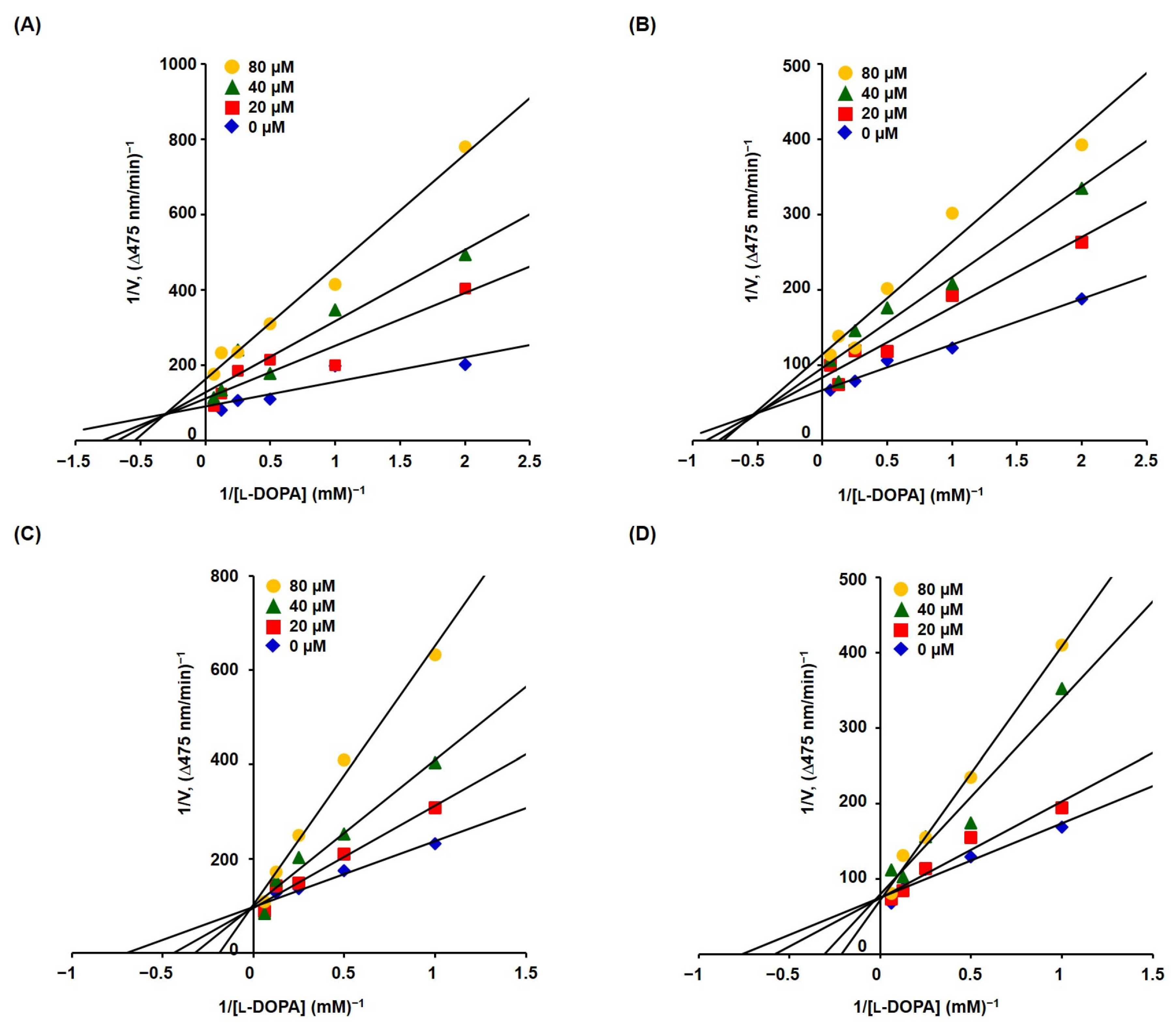 3.10. Inhibitory Mechanism of NBTC Analogs 1, 5, 7, and 9 Against mTYR