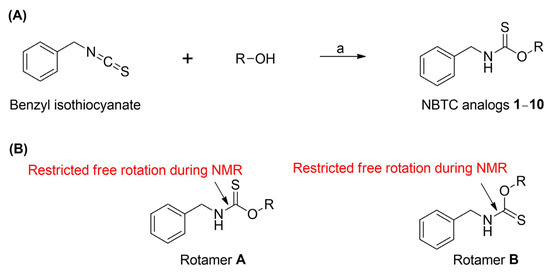 2.2.1. General Protocol for the Preparation of Alkyl Benzylcarbamothioates 1–4 and 10 [35,36]