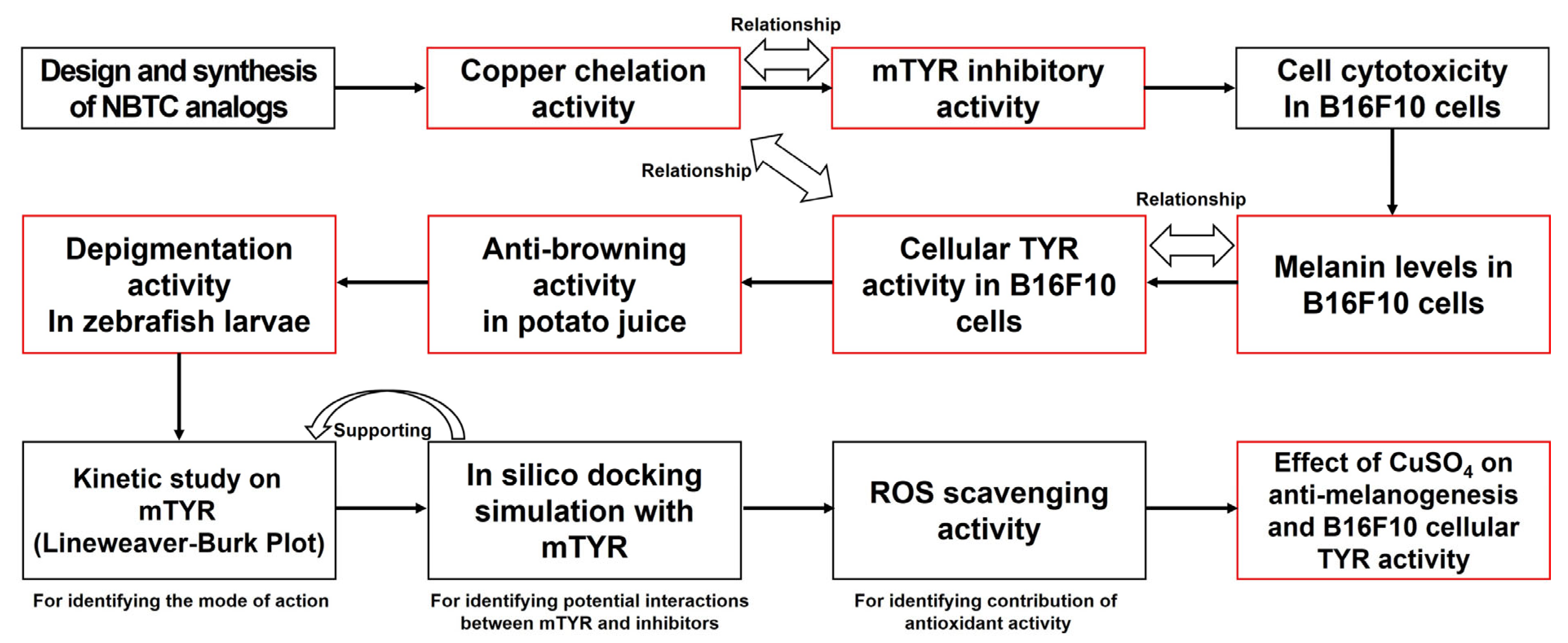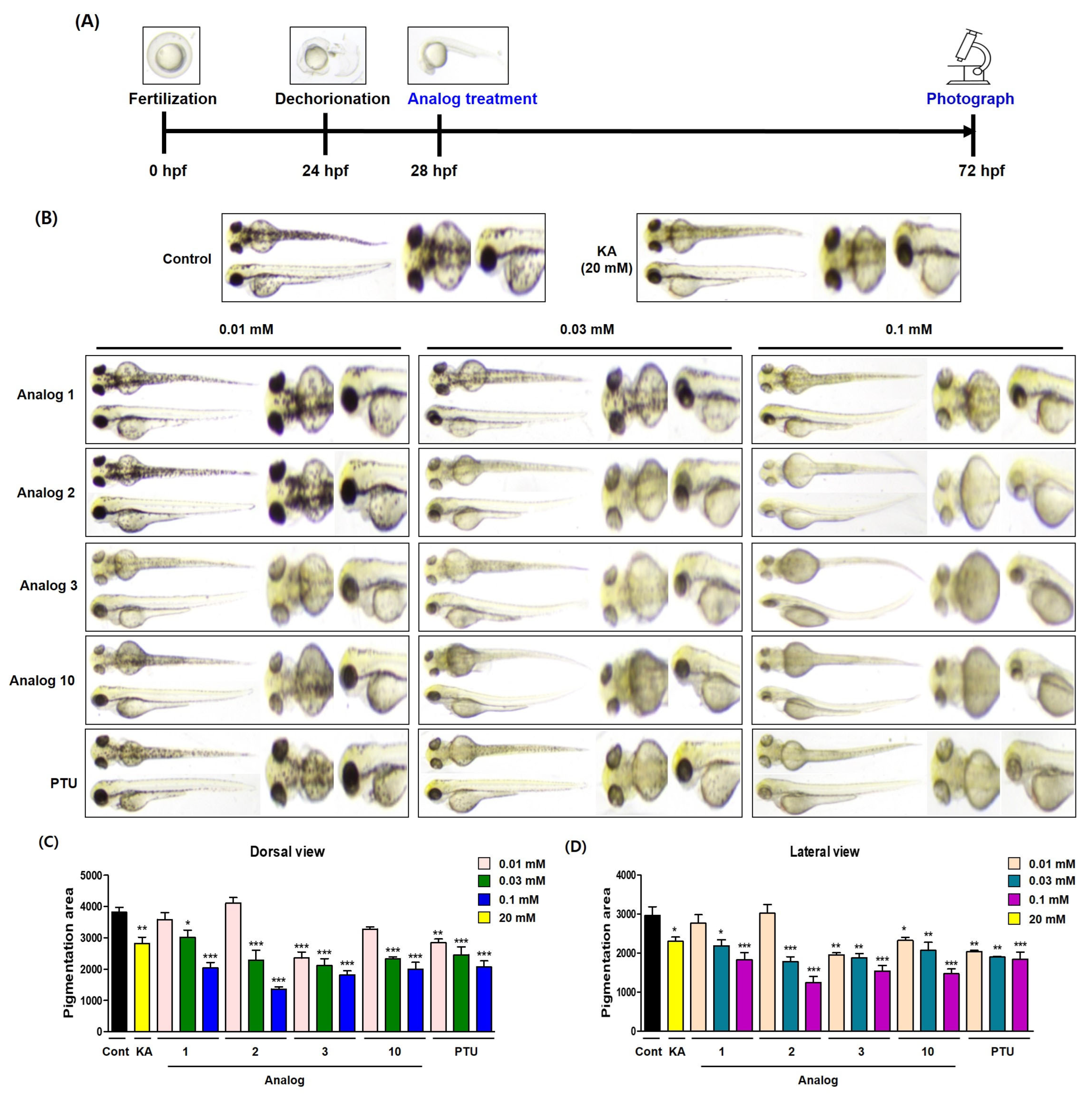 - Yoon, D.; Jung, H.J.; Lee, J.; Kim, H.J.; Park, H.S.; Park, Y.J.; Kang, M.K.; Kim, G.Y.; Kang, D.; Park, Y.; et al. In vitro and in vivo anti-pigmentation effects of 2-mercaptobenzimidazoles as nanomolar tyrosinase inhibitors on mammalian cells and zebrafish embryos: Preparation of pigment-free zebrafish embryos. Eur. J. Med. Chem. 2024, 266, 116136. [Google Scholar] [CrossRef]