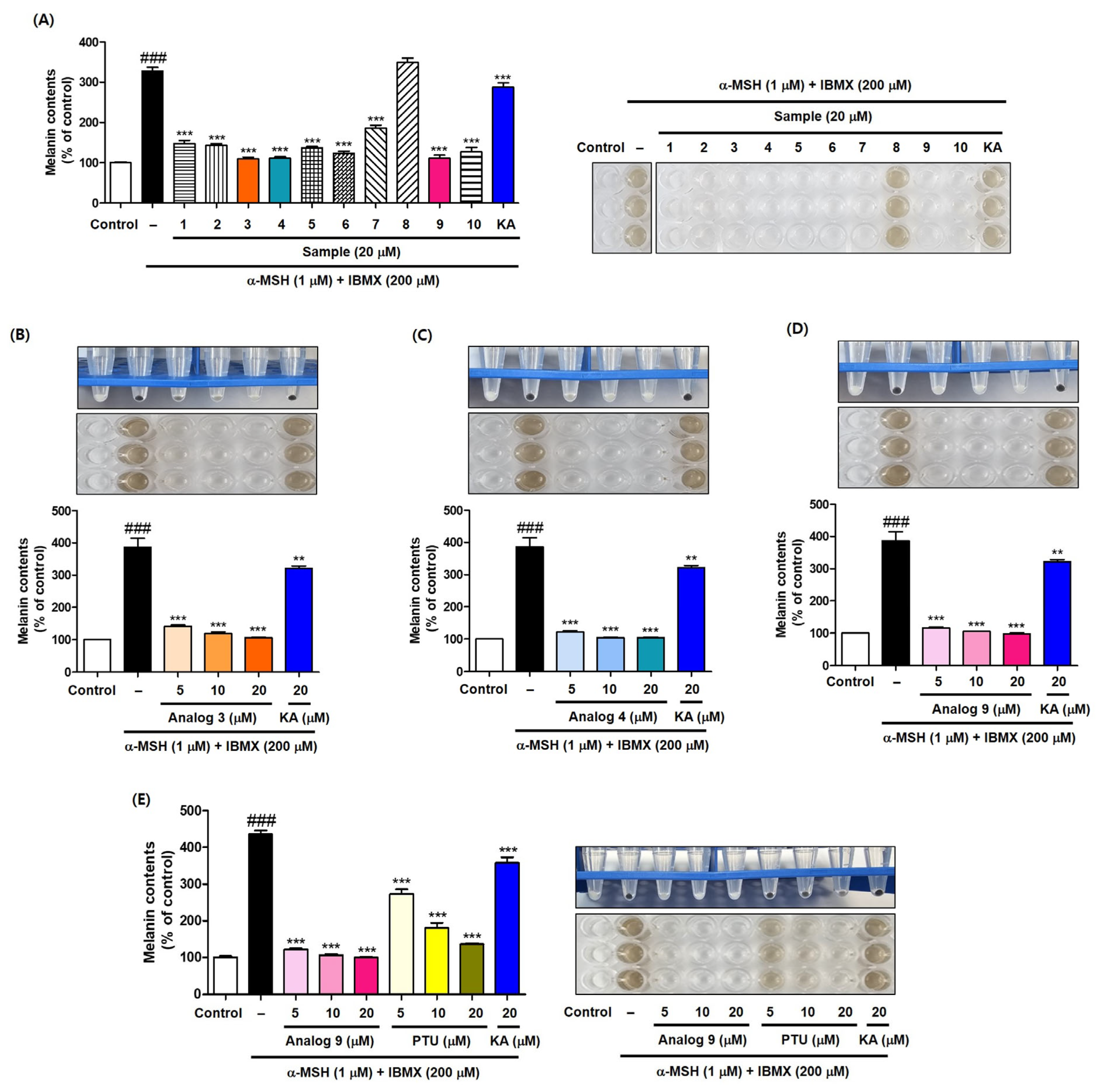 - Jin Jung, H.; Jin Kim, H.; Soo Park, H.; Young Kim, G.; Jung Park, Y.; Lee, J.; Kyung Kang, M.; Yoon, D.; Kang, D.; Park, Y.; et al. Highly potent anti-melanogenic effect of 2-thiobenzothiazole derivatives through nanomolar tyrosinase activity inhibition. Bioorganic Chem. 2024, 150, 107586. [Google Scholar] [CrossRef]