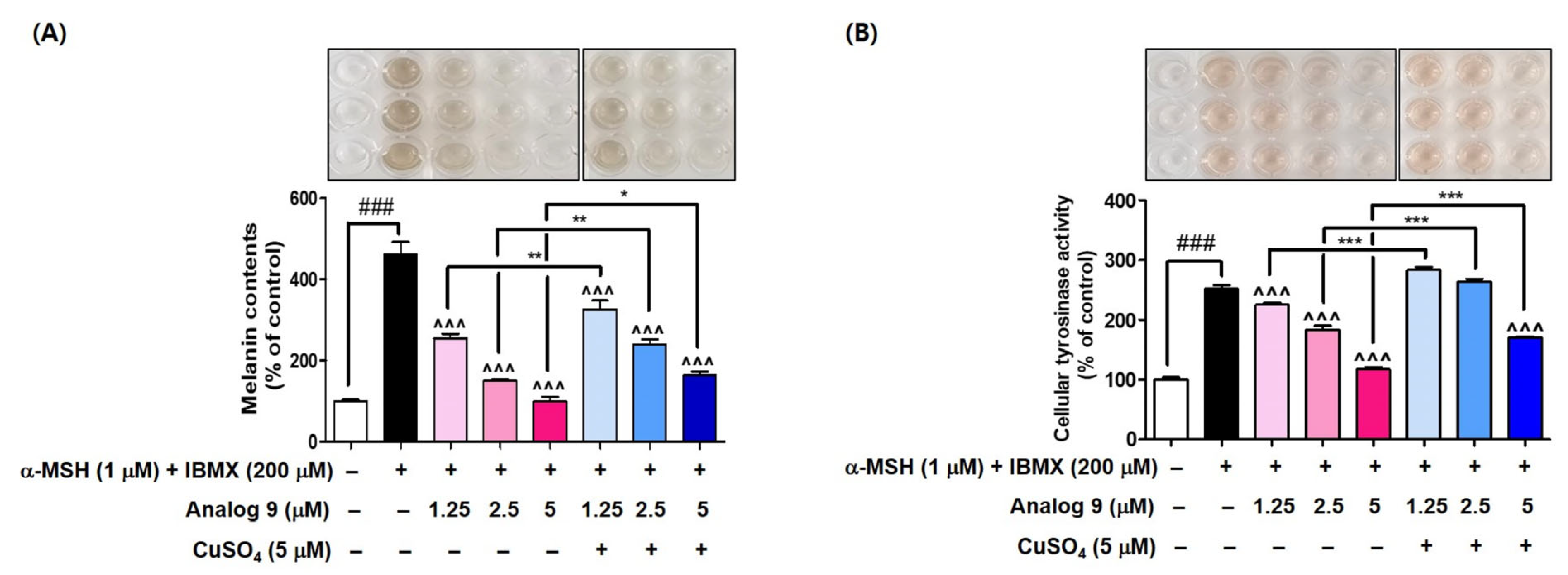 3.14. Effect of Cu2+ Ions on the Ability of Analog 9 to Inhibit Cellular TYR Activity and Melanin Production in B16F10 Cells