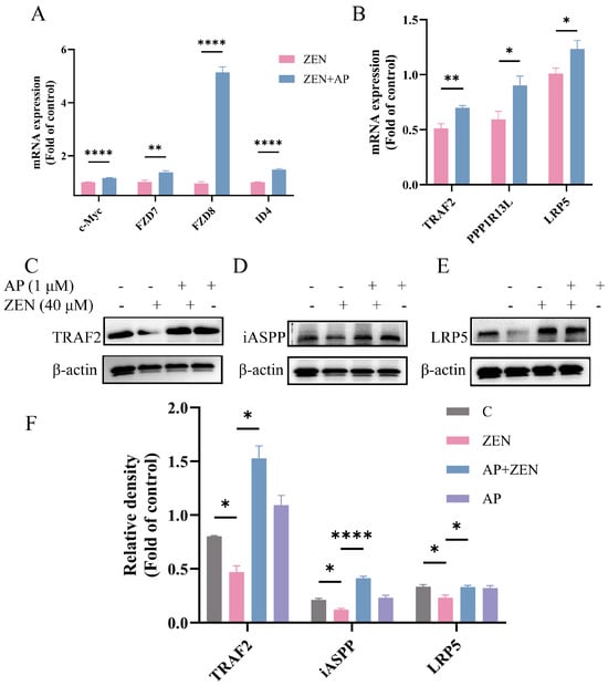 Notably, key genes in this pathway, such as FZD7, FZD8, TRAF2, PPP1R13L, and LRP5, were significantly up-regulated at the transcriptional level, and the expression changes in randomly selected genes were verified via qRT-PCR (Figure 7A,B). Furthermore, Western blot results confirmed that AP significantly activated Wnt pathway-related proteins. Specifically, ZEN treatment reduced LRP5 protein levels, while AP intervention reversed this trend. In addition, ZEN-induced suppression of iASPP and TRAF2 protein expression was also alleviated with AP treatment (Figure 7C–F). Taken together, both transcriptomic and protein-level data demonstrate that ZEN-induced injury to ST cells and the protective effect of AP are closely associated with the regulation of the Wnt signaling pathway.