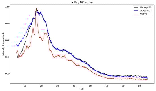 Complexation with the hydrophilic extract of B. tomentosa led to noticeable alterations in the native diffraction pattern. The characteristic peaks between 15° and 23° (2θ) exhibited reduced intensity and partial overlap, indicating a decrease in molecular order and an increase in amorphous content. This suggests that phenolic compounds interact with the starch matrix via hydrogen bonding and surface adsorption, thereby partially disrupting the crystalline order. Such behavior is consistent with the formation of non-inclusion complexes, as previously described for starch–flavonoid systems [43], where direct hydrogen bonding and electrostatic interactions occur without generating detectable V-type reflections in the XRD profile. This structural reorganization supports the partial loss of crystallinity observed in the hydrophilic complex, without fully transforming the native starch polymorph.