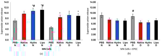 Figure 6. Superoxide anion release in human peripheral blood mononuclear cells (MN) from normoglycemic (N) and diabetic (D) individuals after treatment with native starch (Native), starch complexed with hydrophilic extract (Hydro), and starch complexed with lipophilic extract (Lipo), (a) in the absence and (b) presence of enteropathogenic Escherichia coli (EPEC). Data are expressed as mean ± standard error. * significant difference between untreated and treated cells within the same sample type and group (t-test, p < 0.05); # significant difference between groups (normoglycemic and diabetic) for the same treatment and sample type, in the absence or presence of EPEC (t-test, p < 0.05).