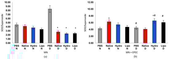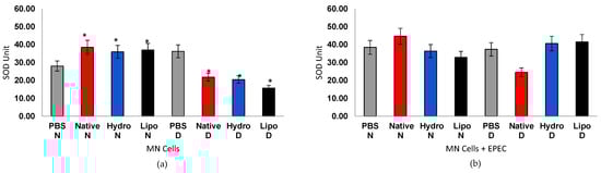 Figure 7. Superoxide dismutase (SOD) activity in human peripheral blood mononuclear cells (MN) from normoglycemic (N) and diabetic (D) individuals after treatment with native starch (Native), starch complexed with hydrophilic extract (Hydro), and starch complexed with lipophilic extract (Lipo), (a) in the absence and (b) presence of enteropathogenic Escherichia coli (EPEC). Data are expressed as mean ± standard error. * Significant difference between untreated and treated cells within the same sample type and group (t-test, p < 0.05).
