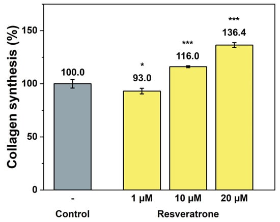 Promotion effect on collagen synthesis by resveratrone. */*** A significant difference at p < 0.05/p < 0.001 (n = 4).