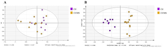 PCA was performed to examine global metabolic variation between the Ctl and CUMS groups. The PCA score plot (Figure 2A) showed partial separation between the groups, with some overlap remaining. Supervised OPLS-DA analysis (Figure 2B) showed separation between the groups, with model statistics of R2X = 0.307, R2Y = 0.931 and Q2 = 0.382, and a CV-ANOVA p-value of 0.0862.