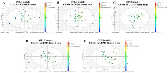 OPLS-R score plots of positive-ion mode metabolomics data illustrating metabolic separation between CUMS and treatment groups. Each model is color-graded according to RI, reflecting metabolite features associated with cognitive performance. Panels show pairwise comparisons: (A) CUMS vs. CUMS-Brahmi, (B) CUMS vs. CUMS-Berry Low, (C) CUMS vs. CUMS-Berry High, (D) CUMS vs. CUMS-BmixB Low, and (E) CUMS vs. CUMS-BmixB High. * indicates the predictive component score of the OPLS model defined by the SIMCA software and does not denote statistical significance.