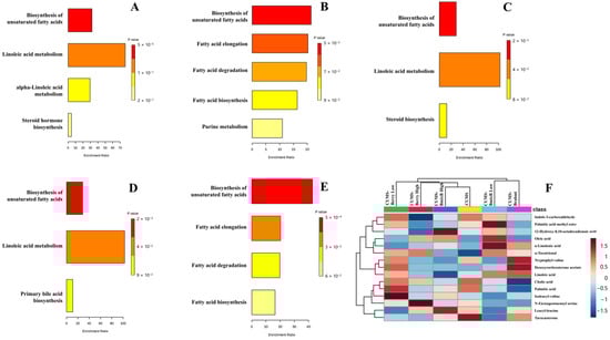 Pathway enrichment analysis indicated treatment-specific metabolic modulation associated with RI, with four pathways showing enrichment across the five intervention groups: biosynthesis of unsaturated fatty acids, linoleic acid metabolism, alpha-linolenic acid metabolism, and fatty acid elongation (Figure 4A–E).