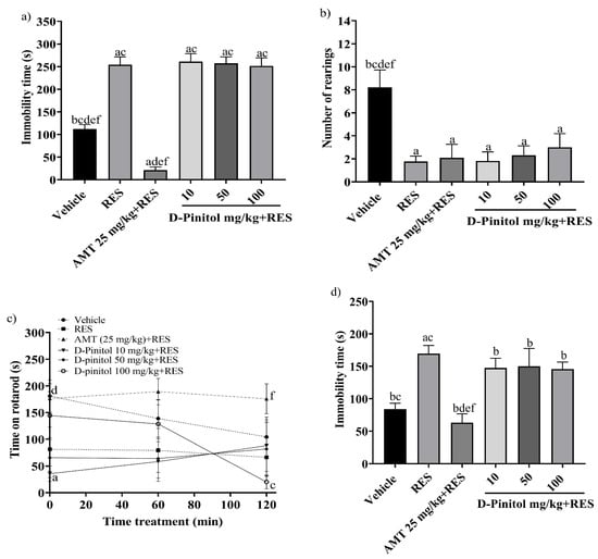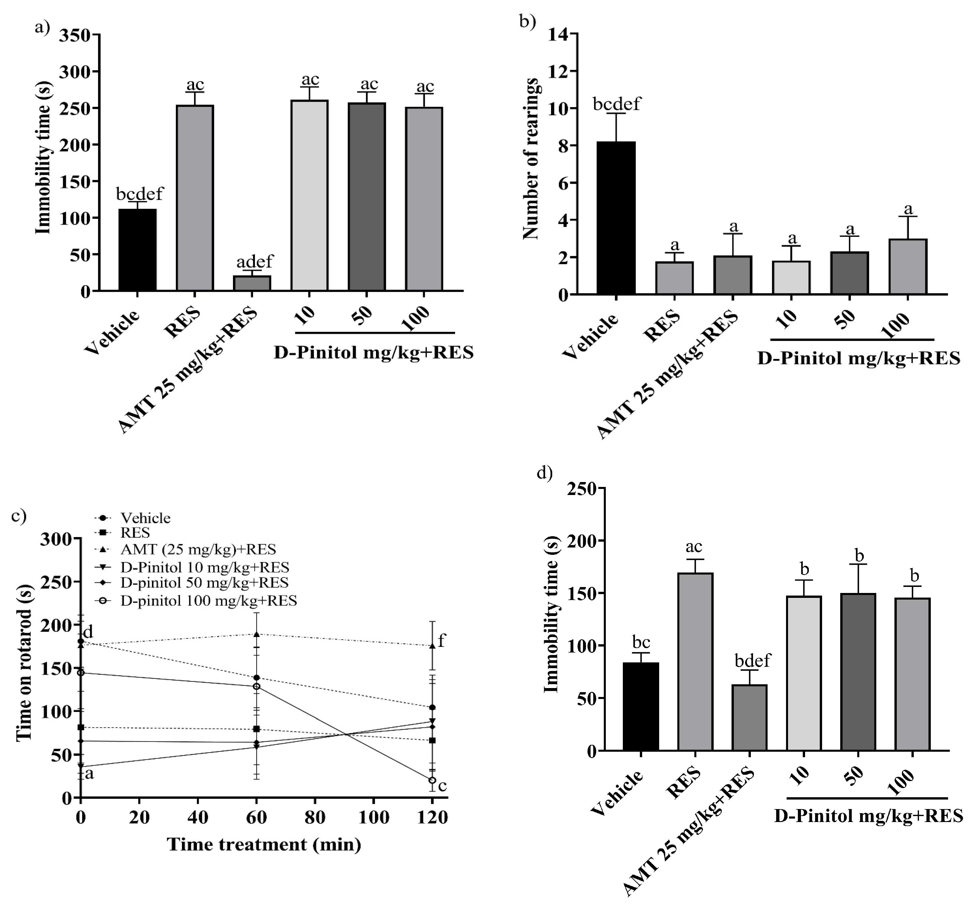 3.1. D-Pinitol Slightly Improves Depression-like Behavior and Motor Activity in a Reserpine-Induced Chronic Depression Model