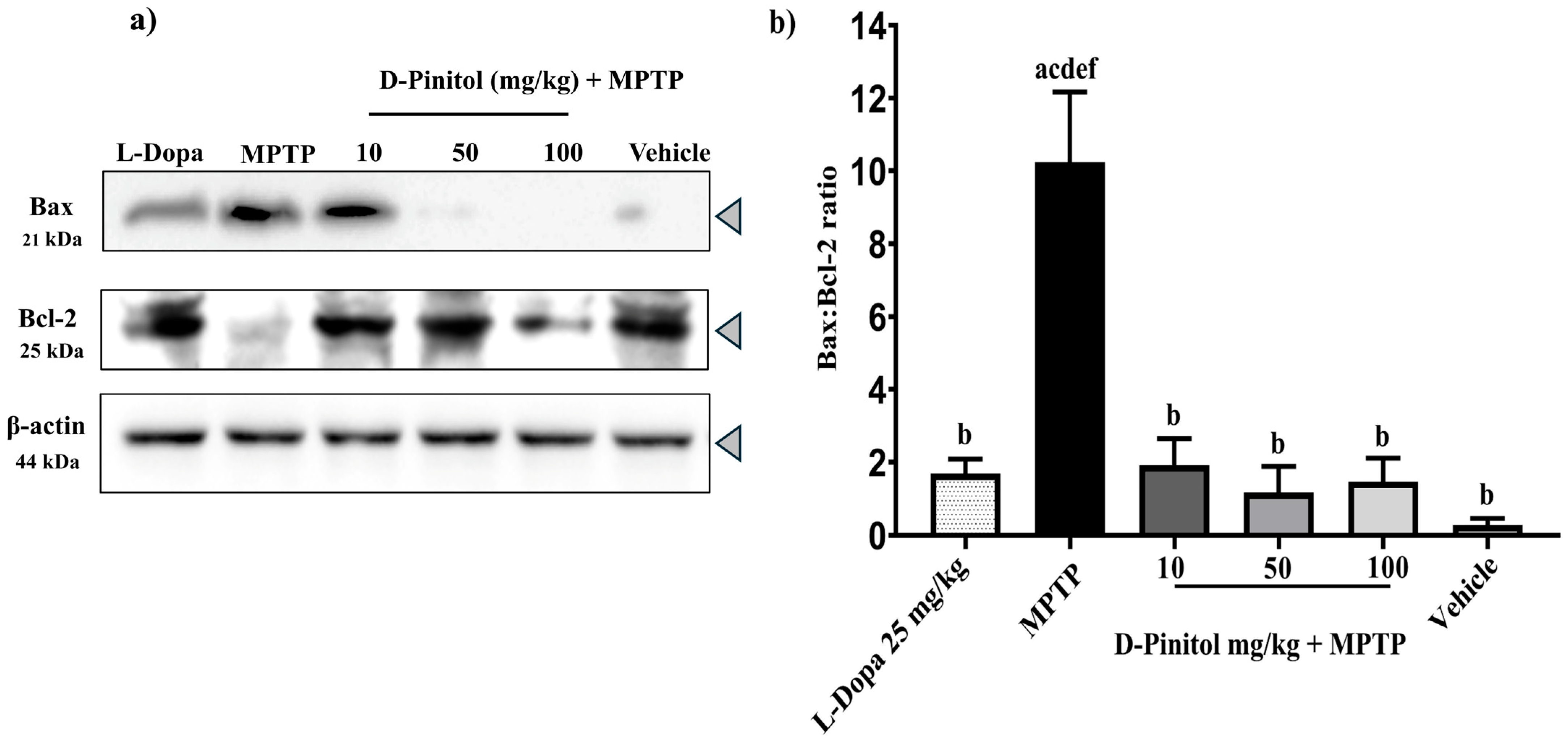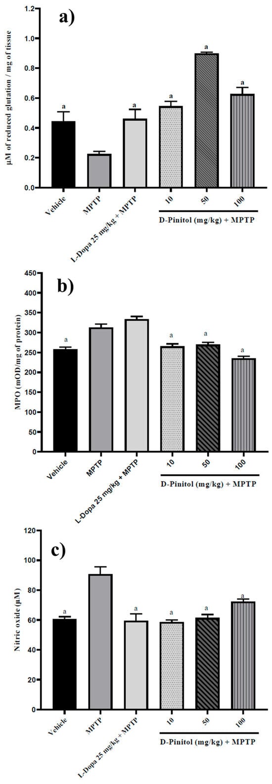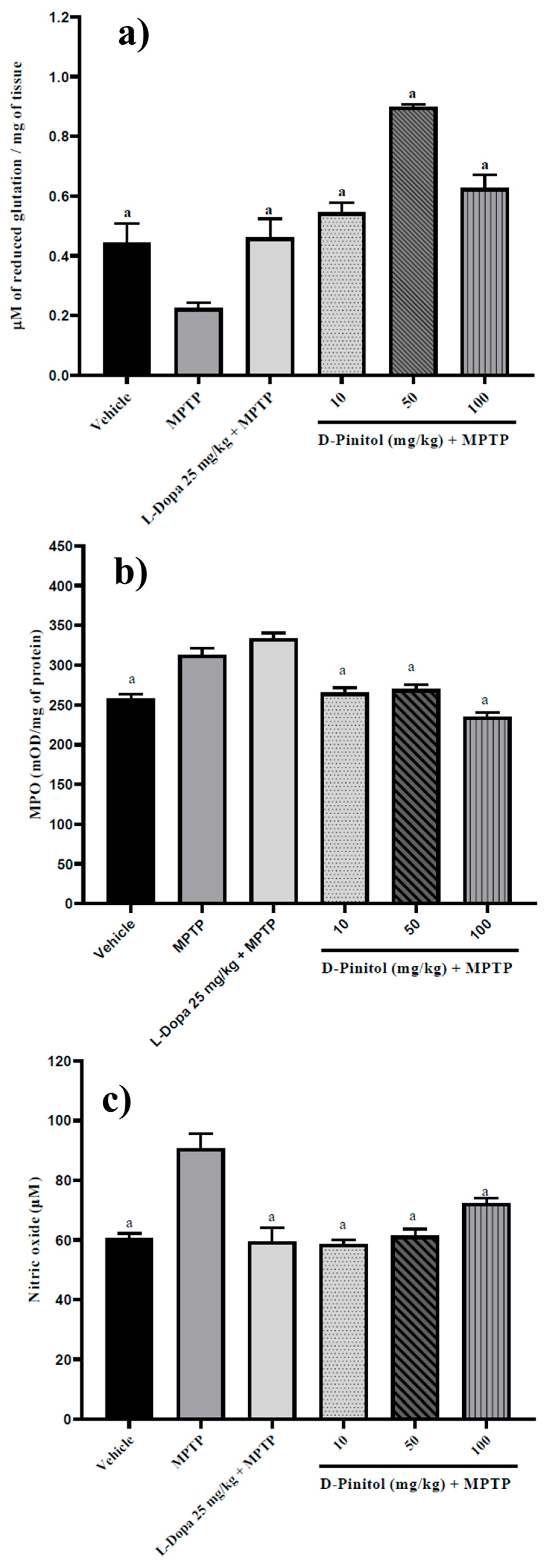 3.7. D-Pinitol Increased Brain Glutathione Levels and Decreased Myeloperoxidase (MPO) Activity and Nitric Oxide (NO) Levels in MPTP-Treated Mice