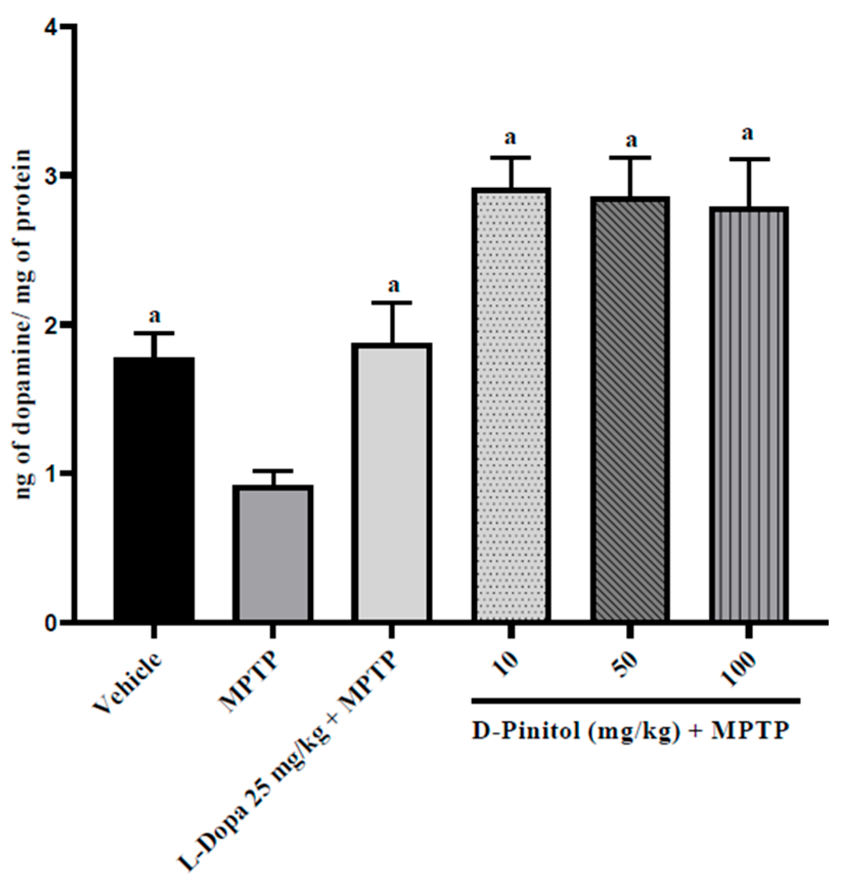 3.6. D-Pinitol Restores the Brain Dopamine Levels in MPTP-Treated Mice