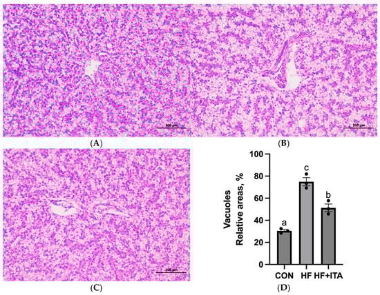 Compared with the CON, the HF showed significant increases in TP, TG, TCHO, LDL, HDL, ALT, and AST levels (p < 0.05). In contrast, the HF + ITA group showed significant decreases in these parameters compared to the HF group (Table 5; p < 0.05).