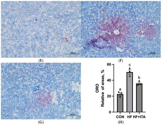 Histological H&E staining revealed significant hepatocellular vacuolization progression in the HF group compared to CON (Figure 1A,B), indicating HFD-induced hepatic injury. Notably, this morphological abnormality was remarkably mitigated by ITA supplementation (Figure 1C,D). These results suggest that ITA can alleviate the structural liver damage induced by HFD. Assessment of Oil Red O-stained liver sections revealed that the area of lipid droplet accumulation (red-stained areas) was markedly increased in the HF group compared with the CON group (Figure 1E,F). In contrast, this lipid deposition was substantially reduced in the HF + ITA group relative to the HF group (Figure 1G,H). Collectively, these data indicate that ITA alleviates the pathological lipid deposition in the liver induced by a high-fat diet.