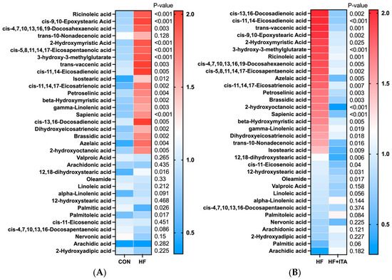 Effects of dietary supplementation with 0.4% ITA on metabolites related to lipid metabolism (fatty acids) in the liver of largemouth bass fed a high-fat diet (n = 3). Metabolomic profiling of the liver was performed on three randomly selected specimens from the CON, HF, and HF + ITA. The heat map illustrates the normalized intensities of fatty acids. Statistical significance was determined at p < 0.05 for comparisons between (A) CON vs. HF and (B) HF vs. HF + ITA.