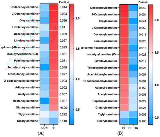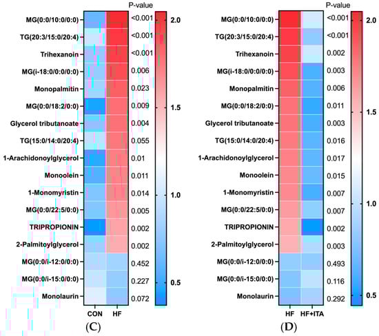 This study conducted a heatmap analysis on metabolites related to fatty acid metabolism in the liver. The HF group exhibited higher relative levels of 19 fatty acids (such as ricinoleic acid and cis-9,10-epoxystearic acid) than the CON group (p < 0.05), as summarized in Figure 2. The HF + ITA group demonstrated a marked decline in the levels of 24 fatty acids (such as cis-13,16-docosadienoic acid and cis-11,14-eicosadienoic acid) compared to the HF group (Figure 2). As shown in Figure 3, compared to the CON group, the relative abundance of 16 acylcarnitines (Dodecanoylcarnitine, 2-Octanoylcarnitine, etc.) significantly increased in the HF group (p < 0.05). Compared to the HF group, 14 acylcarnitines significantly decreased in the HF + ITA group (Dodecanoylcarnitine, 2-Octanoylcarnitine, etc.) (p < 0.05). Compared to the CON group, 13 glycerides (MG (0:0/10:0/0:0), TG (20:3/15:0/20:4), etc.) relative abundance were significantly increased in the HF group (Figure 3, p < 0.05). Compared to the HF group, 14 glycerides significantly decreased in the HF + ITA group (MG (0:0/10:0/0:0), TG (20:3/15:0/20:4), etc.) (Figure 3, p < 0.05).