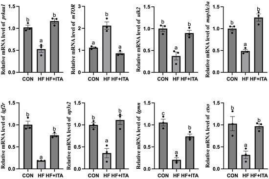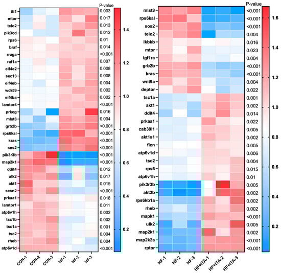 Transcriptome analysis (Figure 5) revealed that, relative to CON, the HF group exhibited significant upregulation of mTOR, telo2, wdr59, and mlst8, while ulk2, tsc1b, tsc1a, tsc2, and rheb were markedly downregulated (p < 0.05). The fragment counts of genes such as mlst8, telo2, mTOR, and deptor were significantly decreased in the HF + ITA group compared with the HF group, while the fragment counts of genes such as tsc1a, tsc2, rheb, ulk2, and rptor were significantly up-regulated (p < 0.05). HFD markedly down-regulated the expression of multiple genes in the “mTOR signaling pathway”, an effect that was significantly reversed upon ITA supplementation (Supplemental Figure S1A,B).