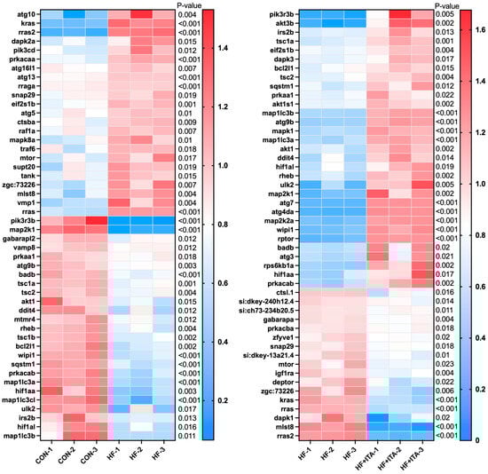 We found that “Autophagy-animal” was present in both comparison pairs: CON vs. HF and HF vs. HF + ITA. Transcriptome data (Figure 6) showed that the fragment counts of atg10, atg16l1, atg13, atg5, mTOR, and other genes were significantly upregulated in the HF group compared to the CON group (p < 0.05). The fragment counts of atg9b, tsc1a, tsc2, akt1, rheb, tsc1b, wipi1, sqstm1, map1lc3a, map1lc3cl, ulk2, map1lc3b and other genes were significantly down-regulated (p < 0.05). The fragment counts of tsc1a, tsc2, sqstm1, map1lc3b, atg9b, map1lc3a, rheb, ulk2, atg7, atg4da, wipi1, rptor, and atg3 were significantly upregulated in the HF + ITA group compared to the HF group (p < 0.05). The mTOR, deptor, and mlst8 were significantly decreased in the HF + ITA compared to HF (p < 0.05) groups. HFD markedly suppressed multiple “Autophagy-animal” genes (Supplemental Figure S2A), with ITA supplementation significantly reversing these reductions (Supplemental Figure S2B).