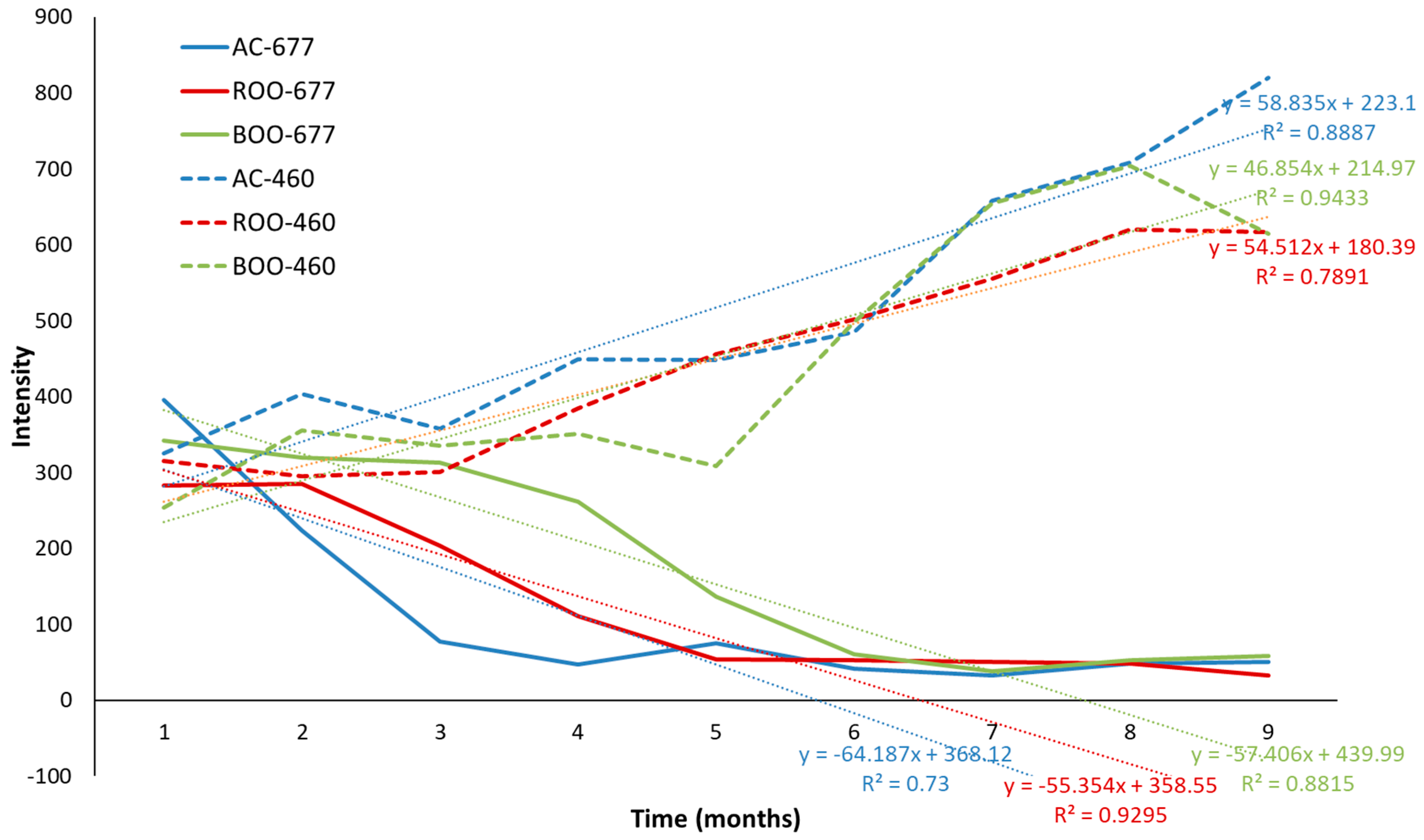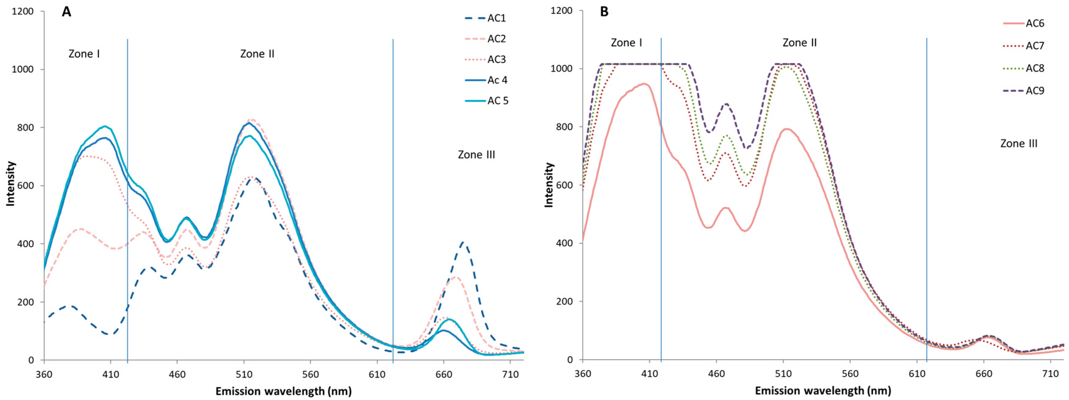 3.3. Autofluorescence Spectral Analysis of the Control Virgin Oil (AC) During Storage