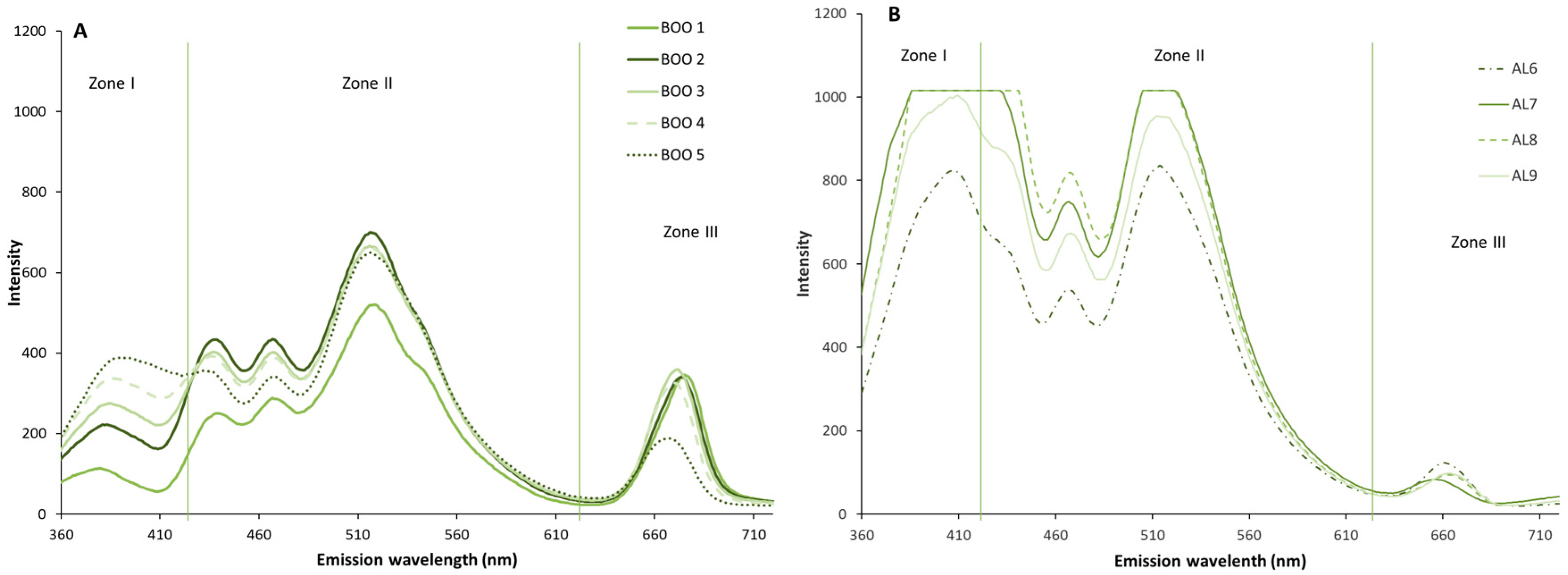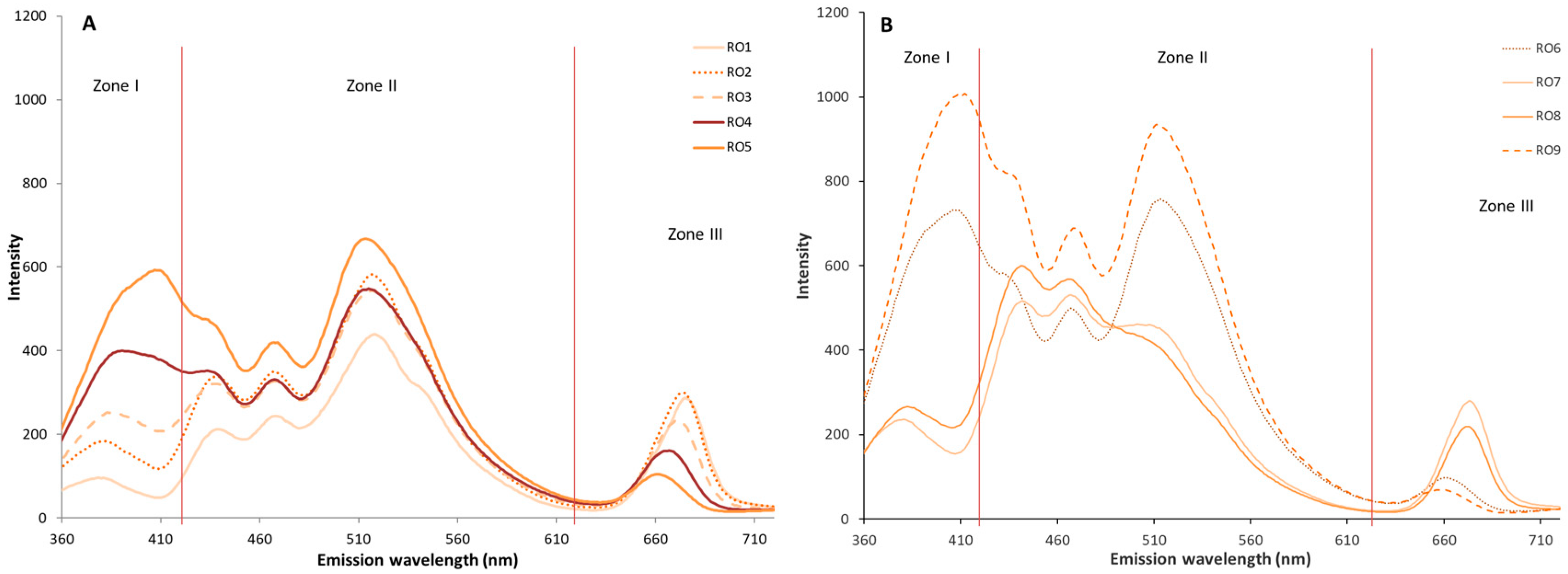 3.4. Comparative Study of Autofluorescence Spectra in Flavored and Unflavored Virgin Olive Oils