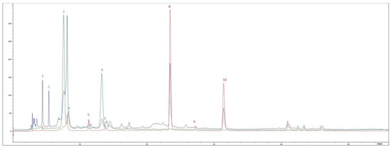 HPLC-DAD chromatograms of the hydroalcoholic extract obtained from red onion peels recorded at 280 nm (red line), 360 nm (blue line), and 530 nm (green line). (1) Taxifolin glycoside, (2) protocatechuic acid, (3) cyanidin 3-glucoside, (4) cyanidin 3-(6″-malonylglucoside), (5) quercetin 7,4′-diclucoside, (6) cyanidin glycoside, (7) quercetin 3,4′-diglucoside, (8) spiraeoside, (9) quercetin glycoside, and (10) quercetin.