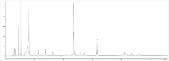 HPLC-DAD chromatograms of the hydroalcoholic extract obtained from yellow onion peels recorded at 280 nm (red line) and 360 nm (blue line). (1) Taxifolin glycoside, (2) protocatechuic acid, (3) quercetin 7,4′-diclucoside, (4) quercetin 3,4′-diglucoside, (5) spiraeoside, (6) quercetin glycoside, and (7) quercetin.