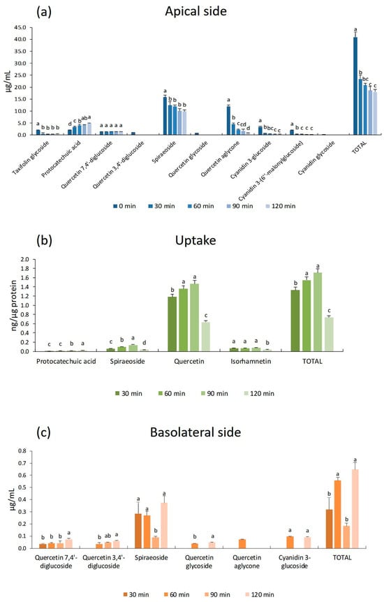 Concentration of the main polyphenols of red onion peels identified by HPLC-DAD analysis in (a) apical compartment, (b) Caco-2 cells, and (c) basolateral compartment after 30, 60, 90, and 120 min of incubation. Different letters above the bars indicate significant differences among incubation times for the same compound, as determined by repeated-measures ANOVA, followed by Tukey’s post hoc test (p < 0.05).