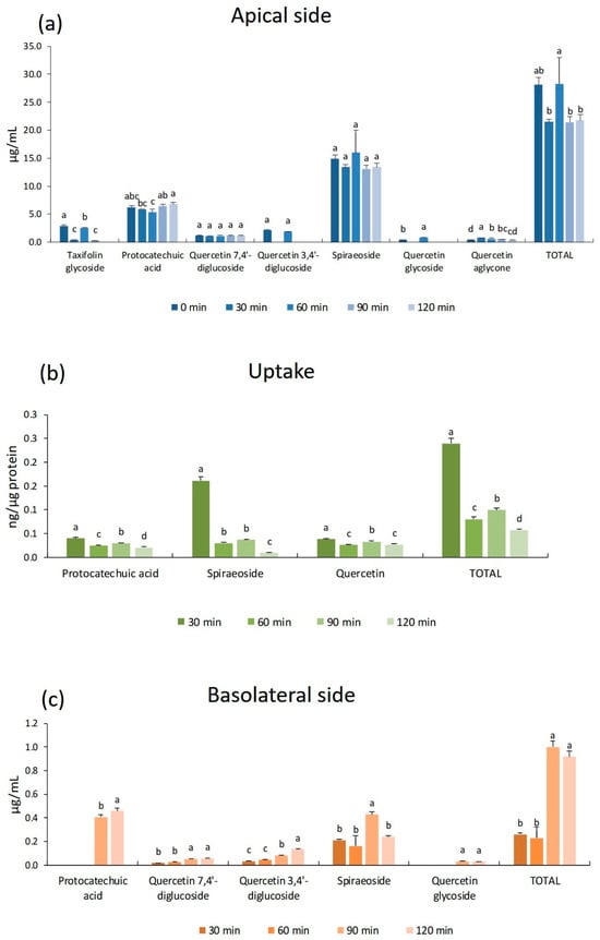 Concentration of the main polyphenols of yellow onion peels identified by HPLC-DAD analysis in (a) apical compartment, (b) Caco-2 cells, and (c) basolateral compartment after 30, 60, 90, and 120 min of incubation. Different letters above the bars indicate significant differences among incubation times for the same compound, as determined by repeated-measures ANOVA, followed by Tukey’s post hoc test (p < 0.05).