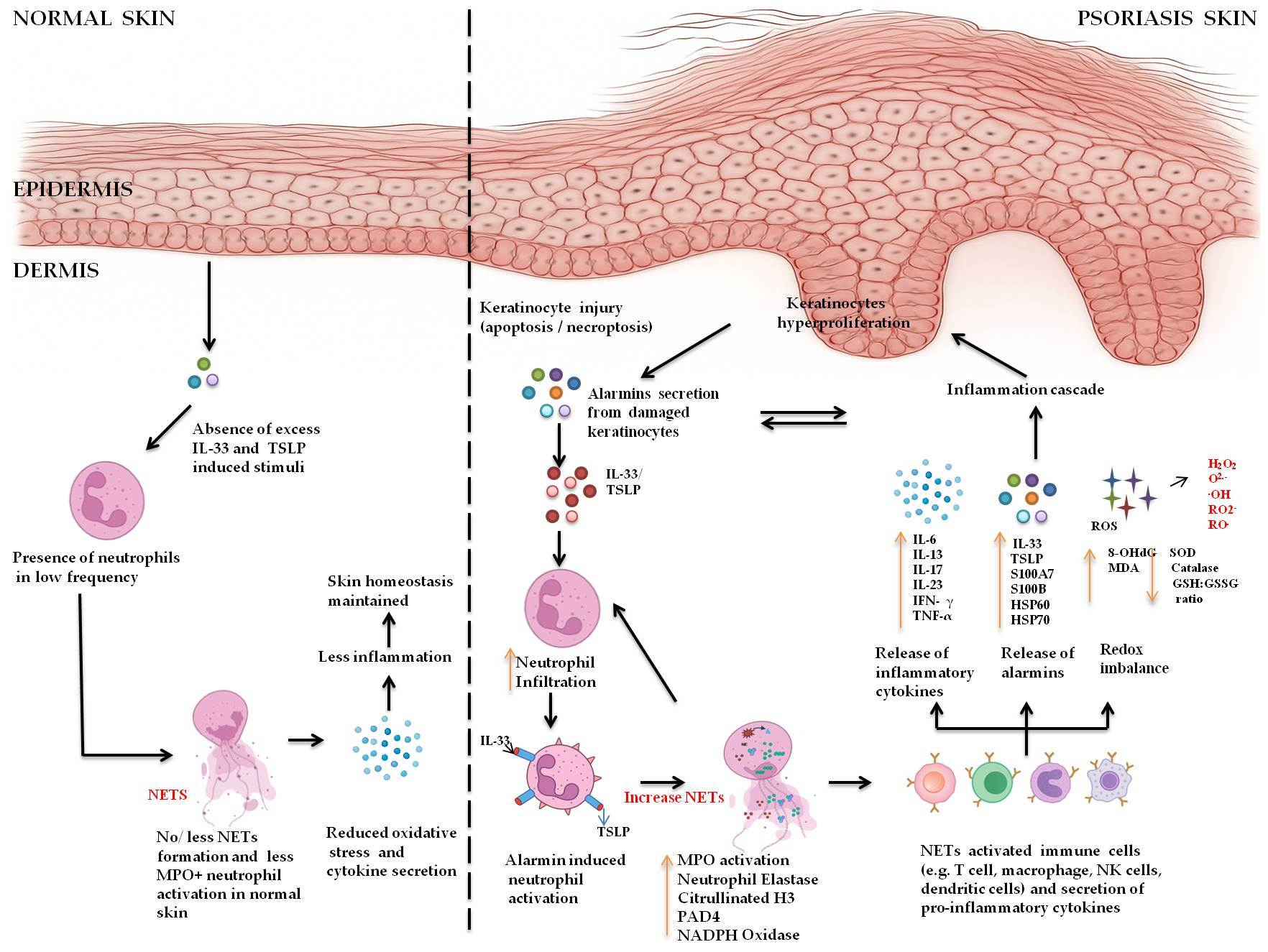 Enhanced Alarmin Secretion Exacerbates Neutrophil Extracellular Trap (NET) Formation in Active Psoriasis: Implication of IL-33 and TSLP in Driving NET Formation, Inflammation and Oxidative Stress in Psoriasis
