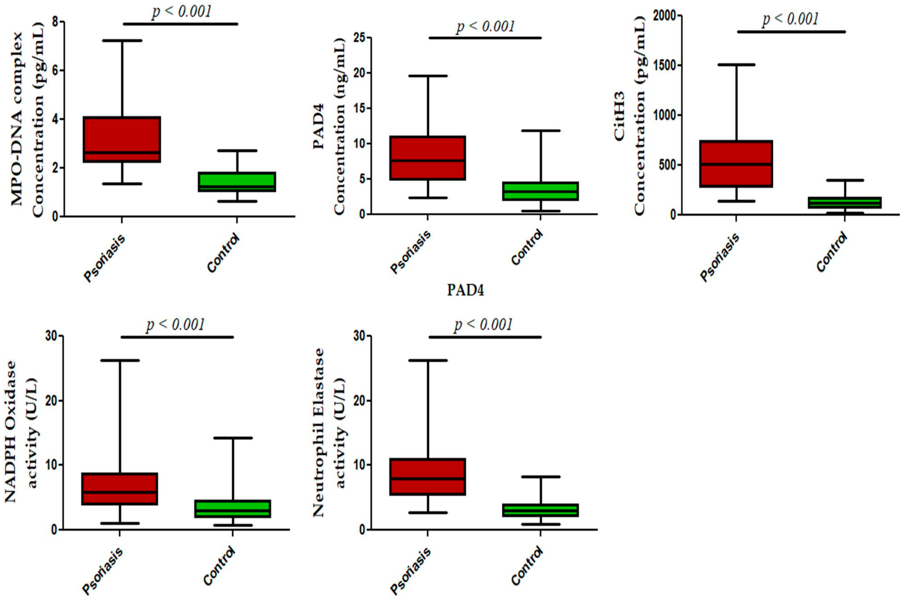 - Czerwińska, J.; Owczarczyk-Saczonek, A. The Impact of Disease Severity on the Serum Levels of Significant Neutrophil Extracellular Trap (NET) Proteins in Patients with Psoriasis. Int. J. Mol. Sci. 2024, 25, 10671. [Google Scholar] [CrossRef]