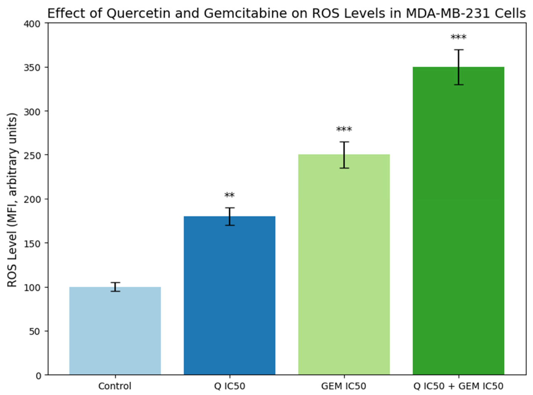 Effect of Q and Gem on intracellular ROS levels in MDA-MB-231 cells. Cells were treated with Q and Gem at their IC50 concentrations, alone or in combination, for 48 h. Intracellular ROS was measured using the DCFDA fluorescent probe (λ_ex = 485 nm, λ_em = 530 nm) and expressed as mean fluorescence intensity (MFI, arbitrary units) ± SD (n = 3). All treatments increased ROS compared with control, with the highest levels in the Q + Gem group, indicating enhanced oxidative stress and apoptosis. Statistical significance was determined by one-way ANOVA with Tukey’s post hoc test: p < 0.01 (**), p < 0.001 (***).
