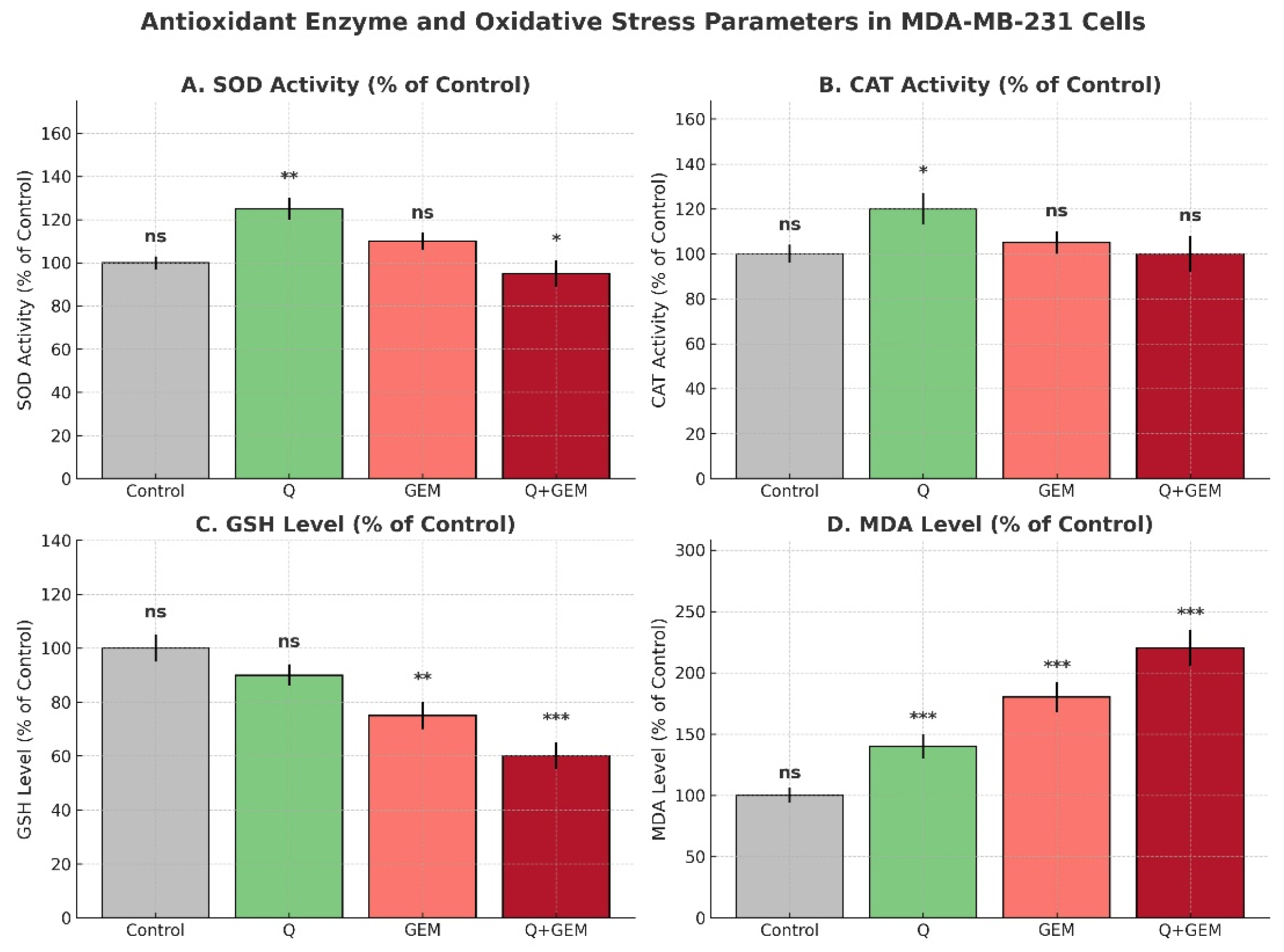 Antioxidant defenses and oxidative stress parameters in MDA-MB-231 cells after treatment with Q, Gem, and their combination (Q + Gem). Enzymatic antioxidants (SOD, CAT) were significantly increased by Q treatment, whereas non-enzymatic antioxidant GSH levels were markedly reduced by Gem and the combination treatment. Lipid peroxidation, assessed by MDA levels, was strongly elevated in Gem and combination groups, indicating enhanced oxidative stress. Values are expressed as percentages of the control (mean ± SD, n = 3). Statistical analysis was performed using one-way ANOVA followed by Tukey’s post hoc test; significance versus control is indicated as p < 0.05 (*), p < 0.01 (**), and p < 0.001 (***); ns = not significant.