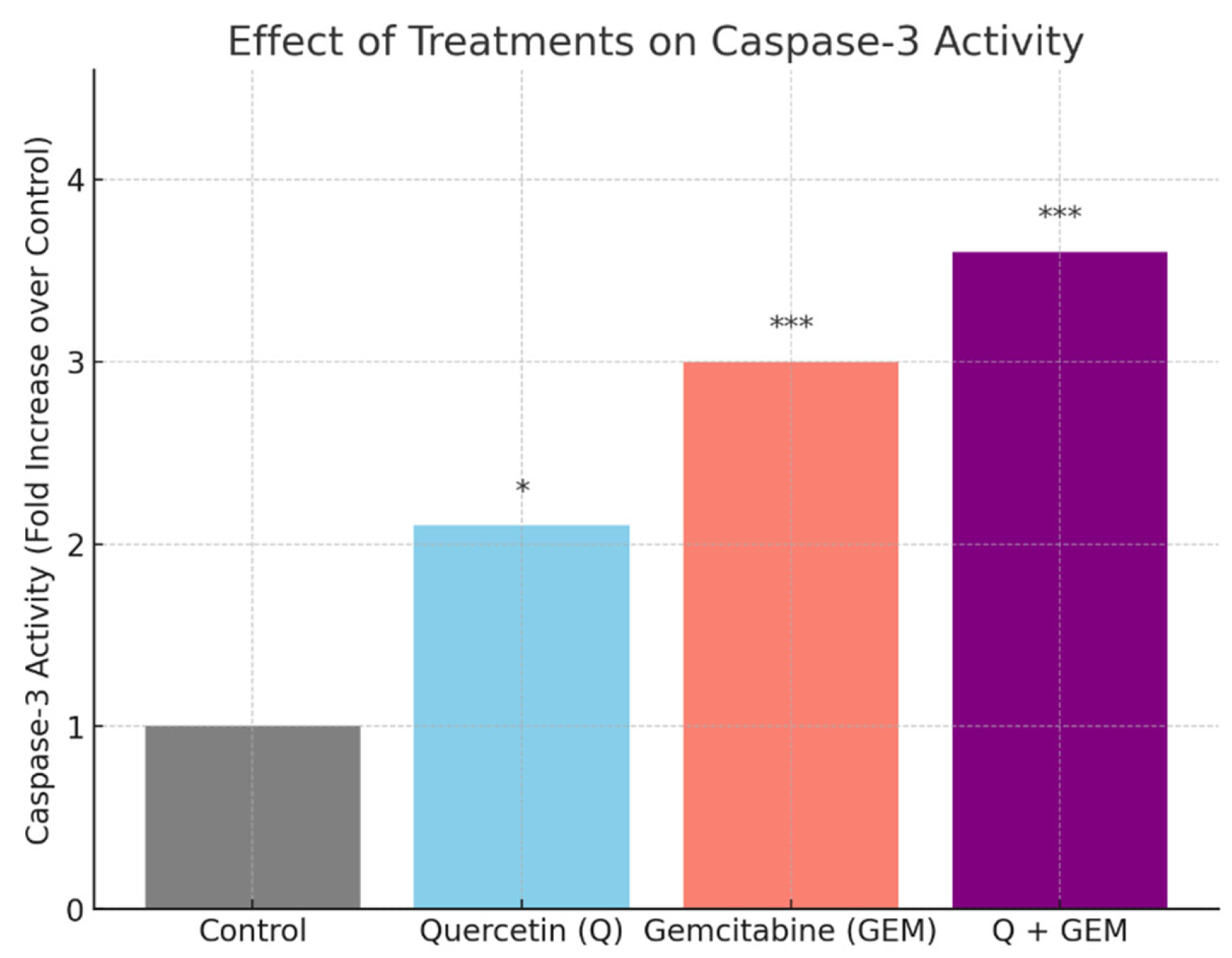 Effect of Q, Gem, and their combination on caspase-3 activity in MDA-MB-231 cells. Cells were treated for 48 h with Q (82.4 µM), Gem (17.2 µM), or Q + Gem at IC50 doses. Caspase-3 activity was measured colorimetrically using the DEVD-pNA substrate. Data are presented as fold change relative to control (mean ± SD, n = 3). Statistical analysis: one-way ANOVA with Tukey’s post hoc test (* p < 0.05, *** p < 0.001).