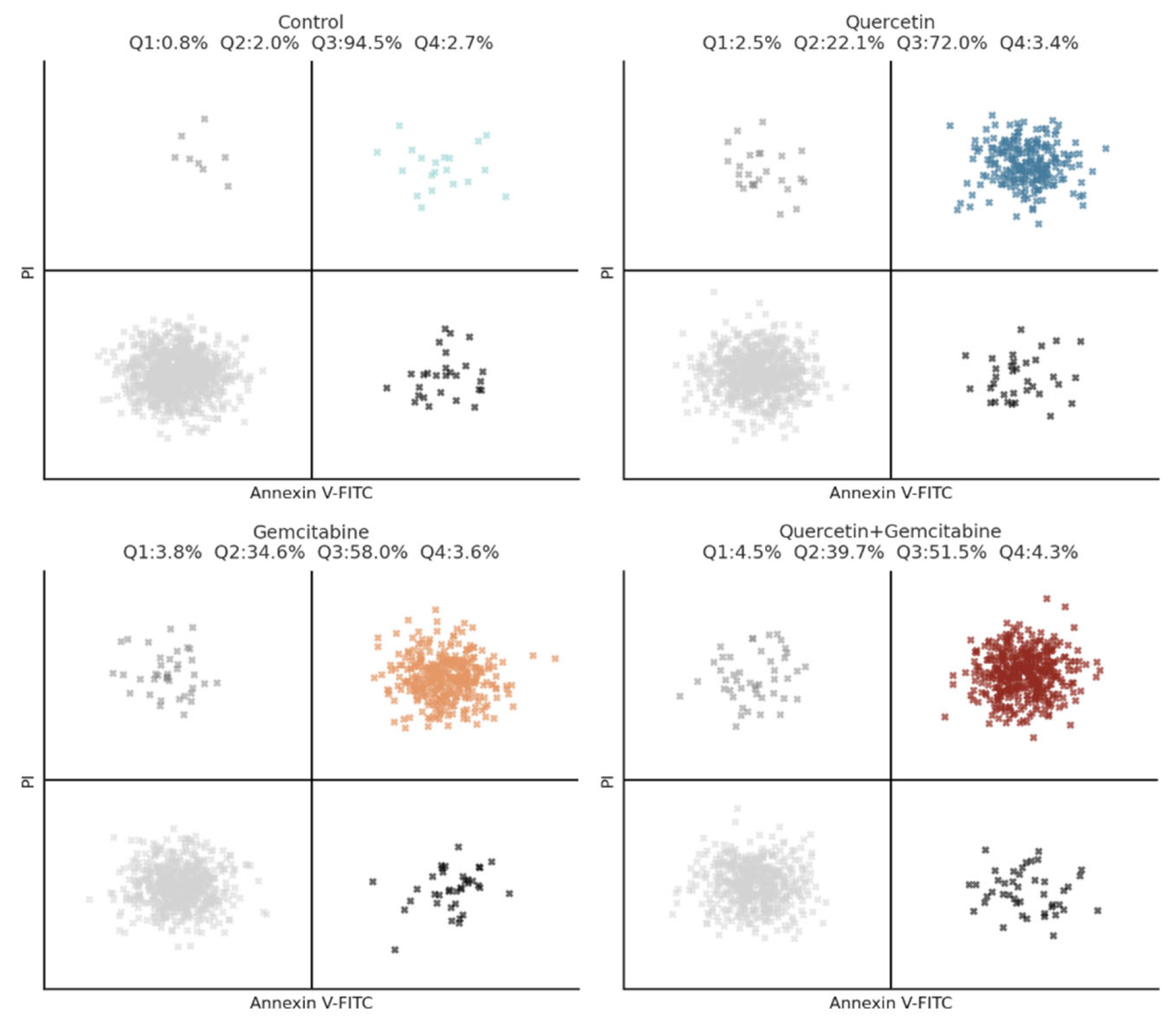 Annexin V-FITC/PI flow cytometric analysis of apoptosis in MDA-MB-231 cells treated with Q, Gem, and their combination. Cells were exposed for 48 h to Q, Gem and Q + Gem at IC50 doses and stained with Annexin V-FITC/PI. Representative dot plots for each group are shown. Quadrants: Q1 = necrotic (Annexin−/PI+), Q2 = late apoptotic (Annexin+/PI+), Q3 = early apoptotic (Annexin+/PI−), Q4 = viable cells (Annexin−/PI−). Total apoptosis increased from 2.8% (control) to 24.6% (Q), 38.4% (Gem), and 44.2% (Q + Gem), demonstrating a clear enhancement of apoptotic cell death by the combination treatment.