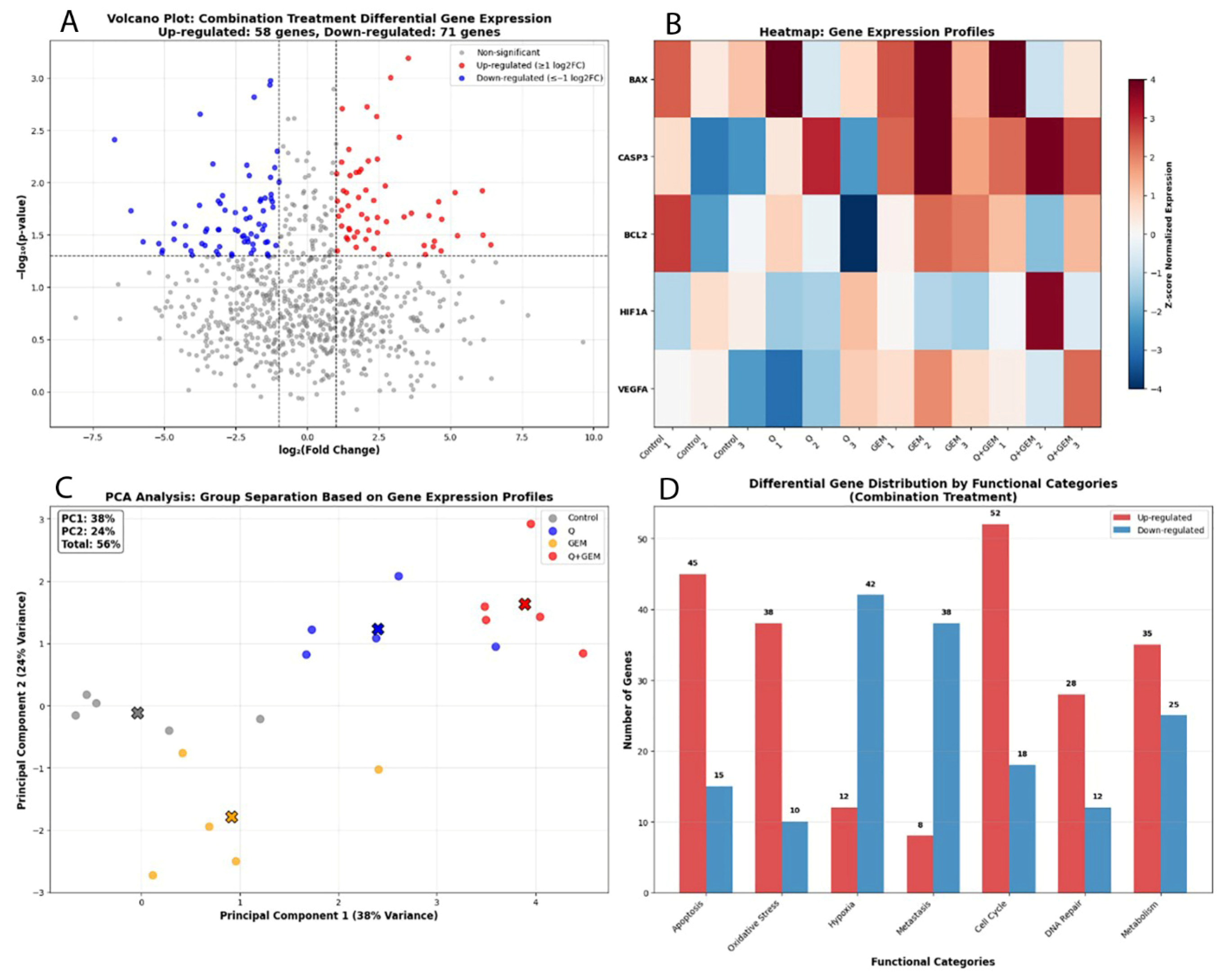 Transcriptomic profiling of gene expression alterations induced by Q, Gem, and their combination (Q + Gem) in MDA-MB-231 cells. (A) Volcano plot showing significantly upregulated (red) and downregulated (blue) genes in the combination treatment (|log2FC| ≥ 1, p < 0.05). Upregulated genes were primarily associated with apoptotic signaling and oxidative stress response, whereas downregulated genes were linked to hypoxia and metastatic processes. (B) Heatmap of the top differentially expressed genes, illustrating distinct expression patterns between control, single-agent, and combination groups. Notably, BAX and CASP3 were markedly upregulated, while HIF1α, VEGFA, and BCL2 were downregulated in the combination group, confirming synergistic pro-apoptotic and anti-angiogenic effects. (C) PCA (Principal Component Analysis) showing clear segregation of the combination group (Q + Gem) from control and single-agent treatments. PC1 and PC2 accounted for 38% and 24% of the total variance, respectively (cumulative 56%), indicating distinct transcriptional reprogramming under combined treatment. (D) Differential gene distribution by functional categories in the combination group. Genes related to apoptosis (45 upregulated, 15 downregulated), oxidative stress (38 upregulated, 10 downregulated), and cell cycle control (52 upregulated, 18 downregulated) showed predominant upregulation, reflecting enhanced activation of pro-apoptotic and stress-related molecular pathways.