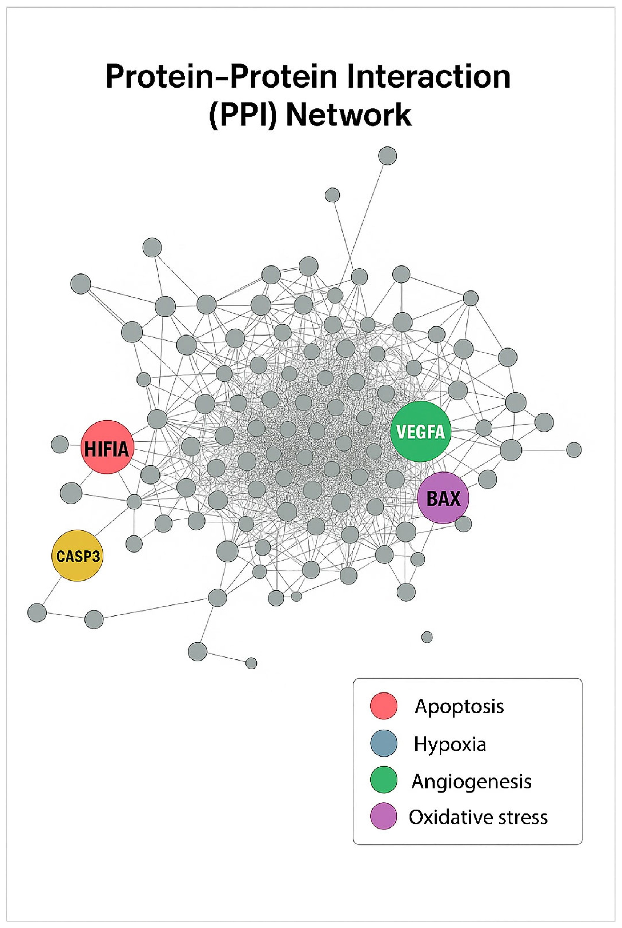 PPI Network. The PPI network was constructed using STRING (v12) and visualized in Cytoscape (v3.10). Each node represents a differentially expressed gene, and edges indicate protein–protein associations. Hub genes with high connectivity were identified as HIF1α (blue, hypoxia), CASP3 (red, apoptosis), VEGFA (green, angiogenesis), and BAX (purple, oxidative stress). These central nodes are proposed to mediate key molecular interactions underlying the combined antitumor effects of Q and Gem.