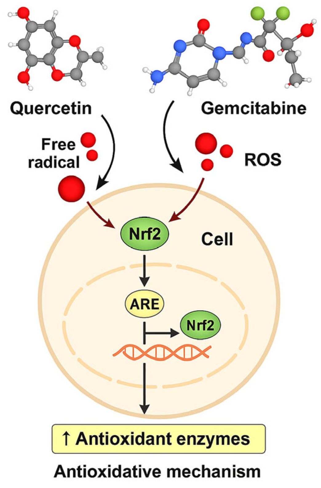 Schematic of the proposed Nrf2/ARE-centered redox mechanism of Q and GEM in MDA-MB-231 cells. Q modulates ROS and activates Nrf2/ARE, inducing antioxidant enzymes (SOD, CAT), while GEM increases ROS. Combined treatment overwhelms antioxidant defenses, causing GSH depletion, mitochondrial dysfunction, and apoptosis (↑Bax, ↑Caspase-3, ↓Bcl-2), alongside downregulation of HIF-1α/VEGF, suppressing survival and angiogenesis.