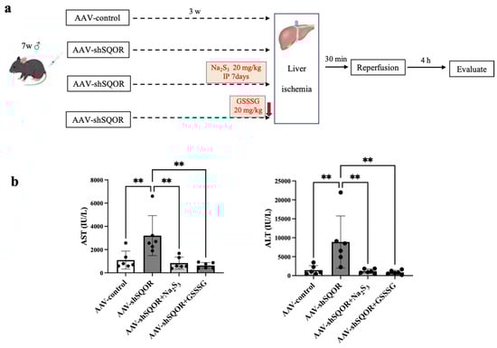 Liver function following hepatic ischemia–reperfusion injury in AAV-control, AAV-shSQOR, AAV-shSQOR+Na2S3, and AAV-shSQOR+GSSSG mice. (a) Flowchart of the experimental protocols. (b) The levels of AST and ALT 4 h after reperfusion in mice. The data are presented as n = 6 per group. Significant differences between groups were determined using one-way analysis of variance. Data are expressed as the means ± standard deviations, ** p < 0.01.